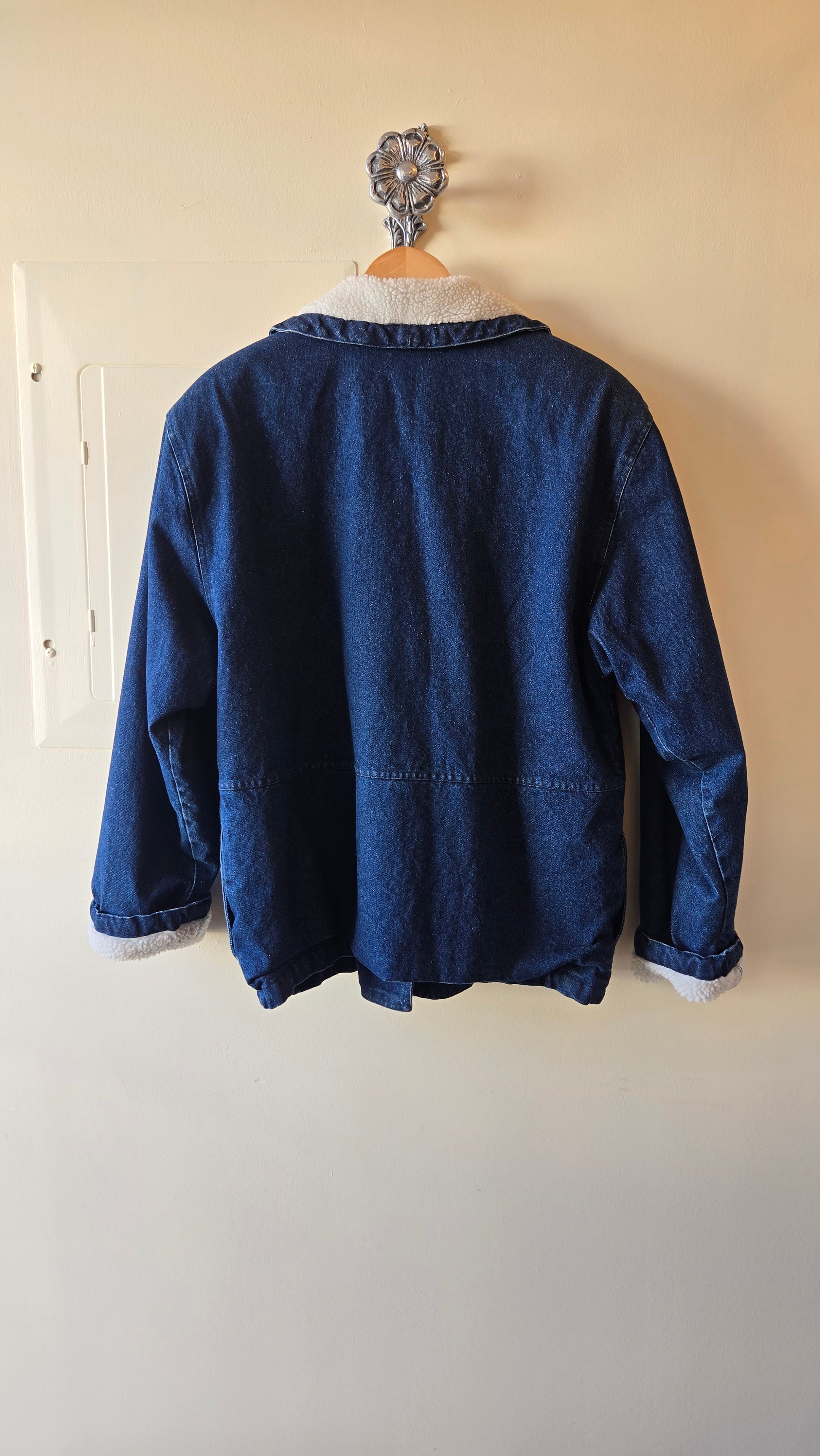 Sweet 80s goodness in this Ann Taylor denim jacket. The shawl collar and cuffs have shearling along the front but the jacket itself is lined in a flannel cotton. The cut of the jacket is double breasted - the buttons don't line up in the front, which I love. Another cool feature is the tab that buttons the shawl collar down. So good. There are four (!) pockets. In perfect condition!