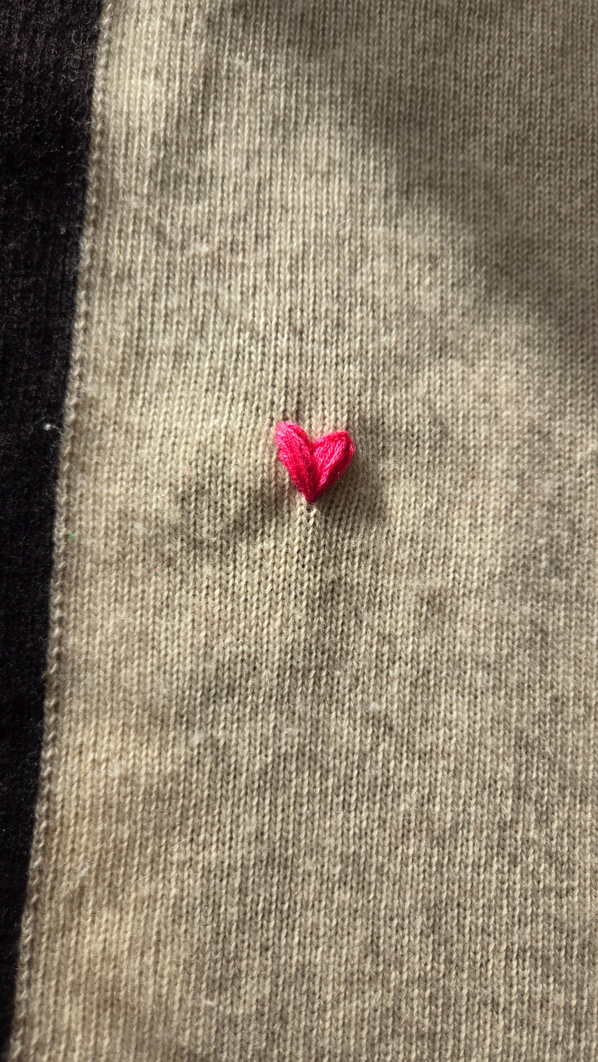 How fabulous!! This B&W wonder is 100% cashmere from Saks Fifth Avenue. I love the harlequin sleeves so much! This beauty had one stain at the front and two on left sleeve which I've covered in pink little hearts. Otherwise, the most perfect sweater to (comfortably) catch attention!
