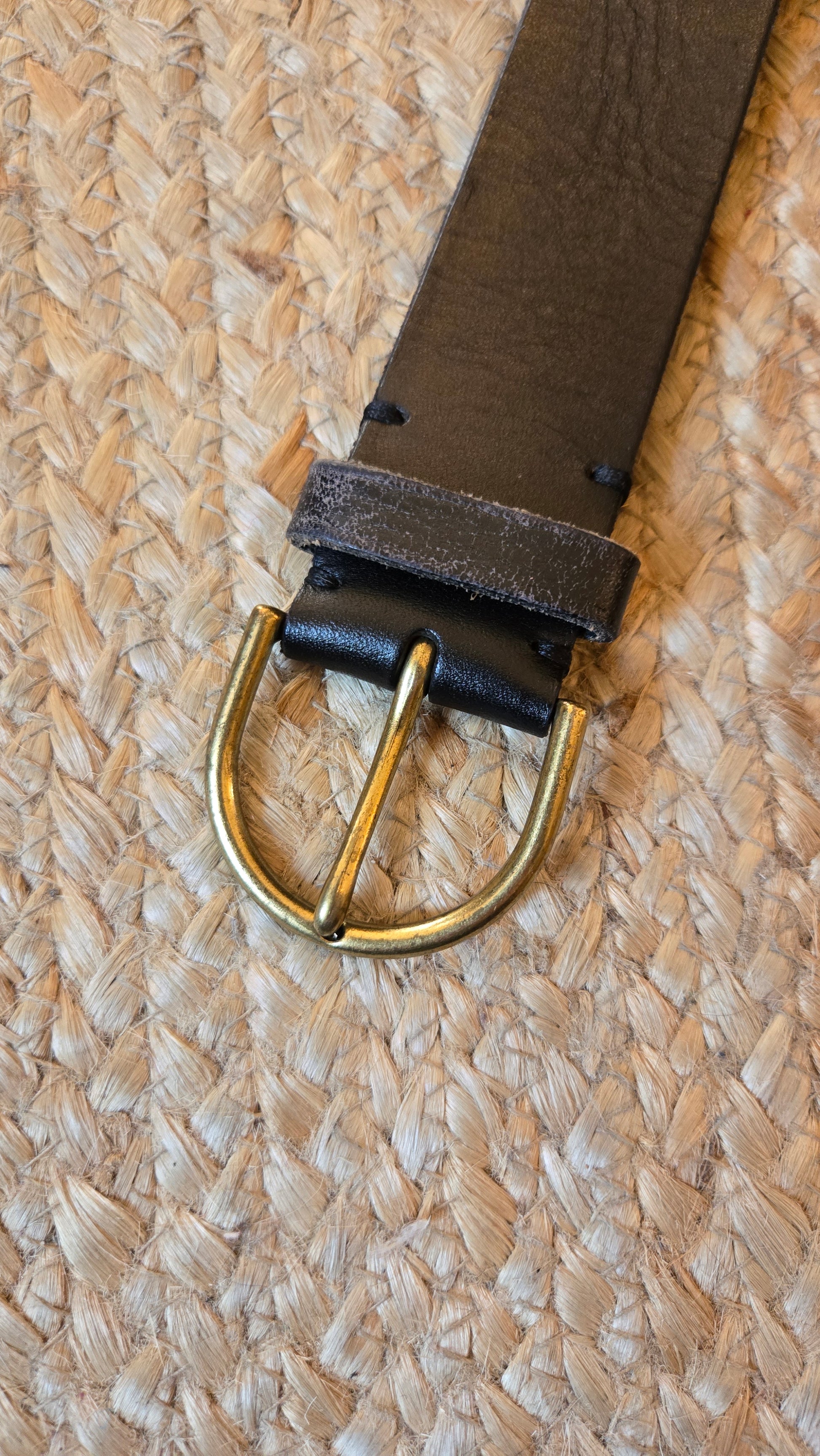 Black leather belt from American Eagle with a burnished brass-colored buckle. Eternal classic and in great shape.