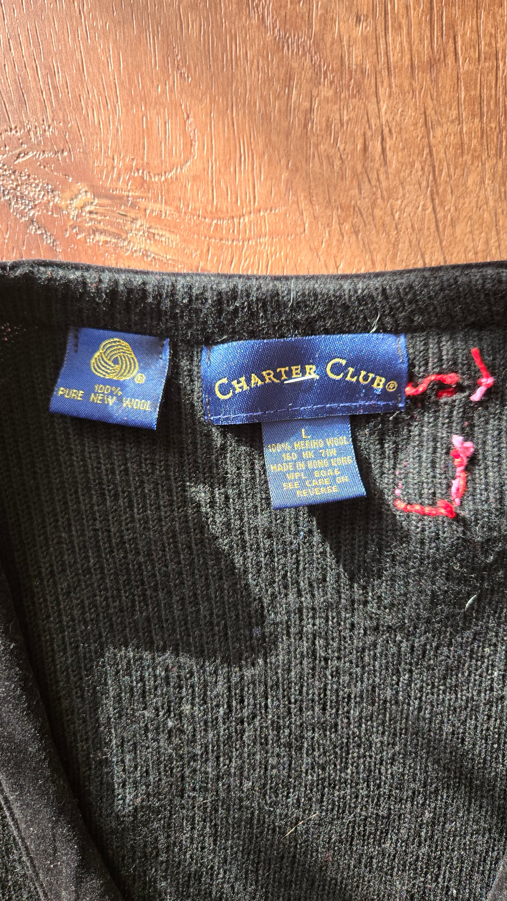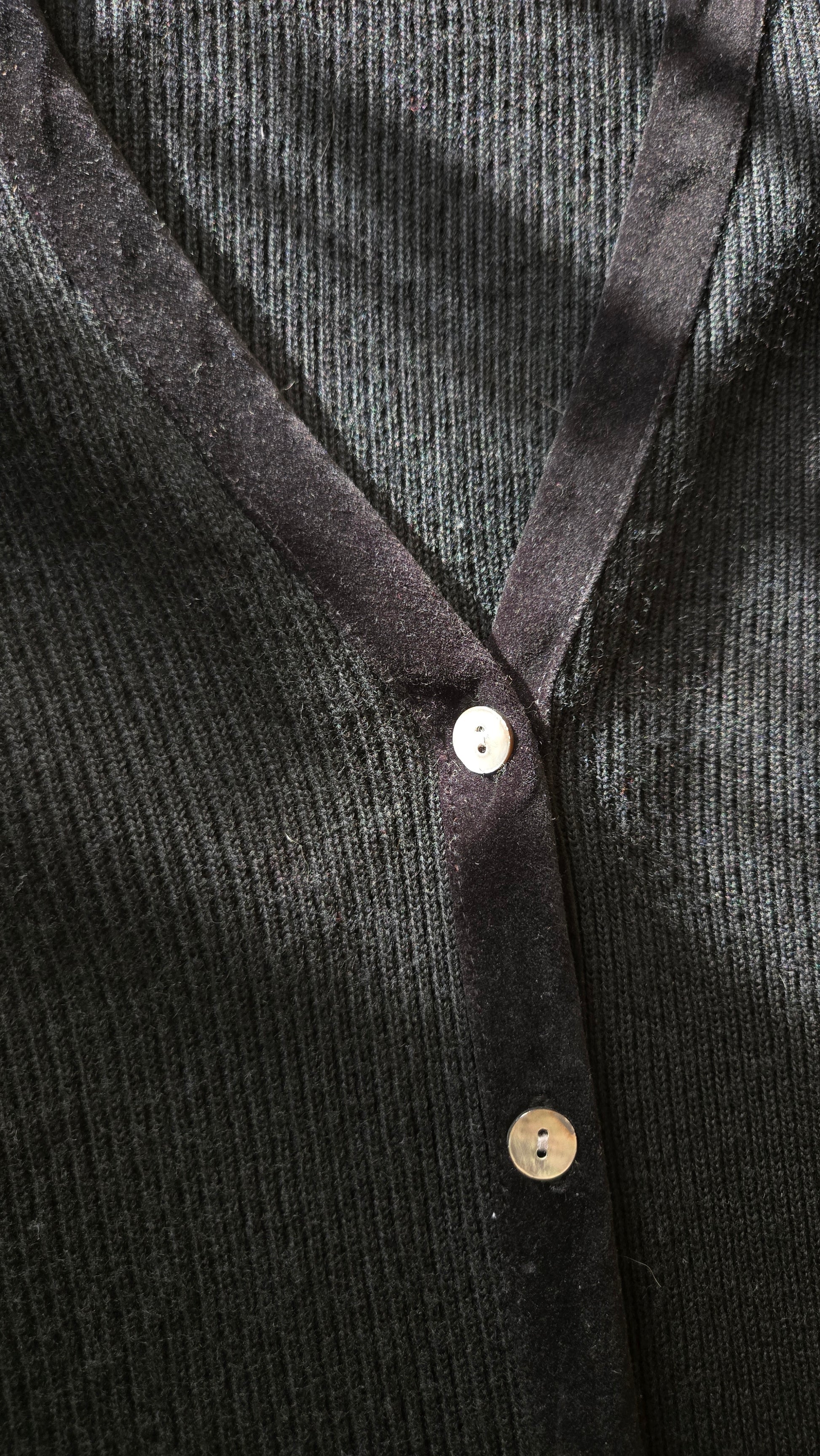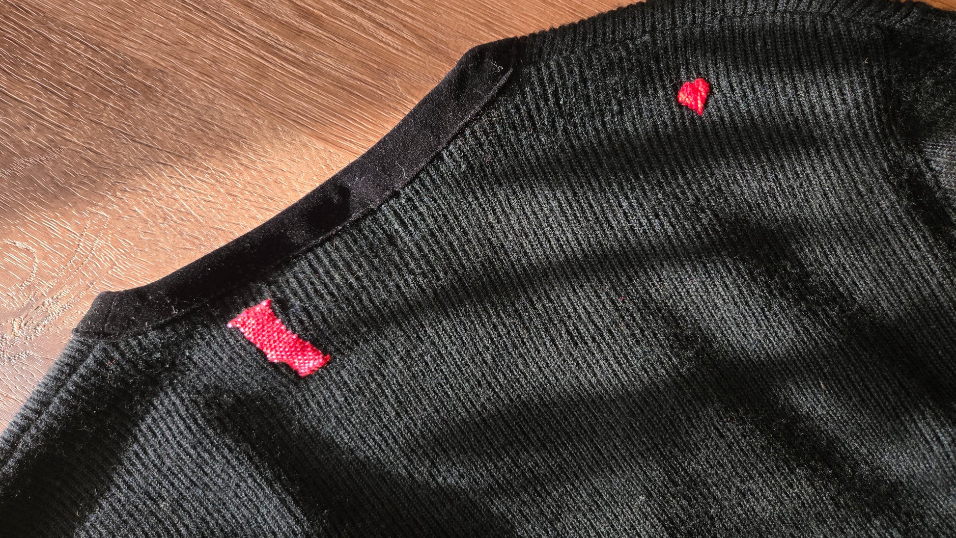 My first mended piece! This fabulous long cardigan is 100$ merino wool, so I don't find it itchy in the same way a classic wool is (LOVE merino). Has a ribbed body, velvet trim and buttons, and a deep v-neck. Had two holes at the back neckline, one I've visibly mended in pink and red and the other with a little red heart!