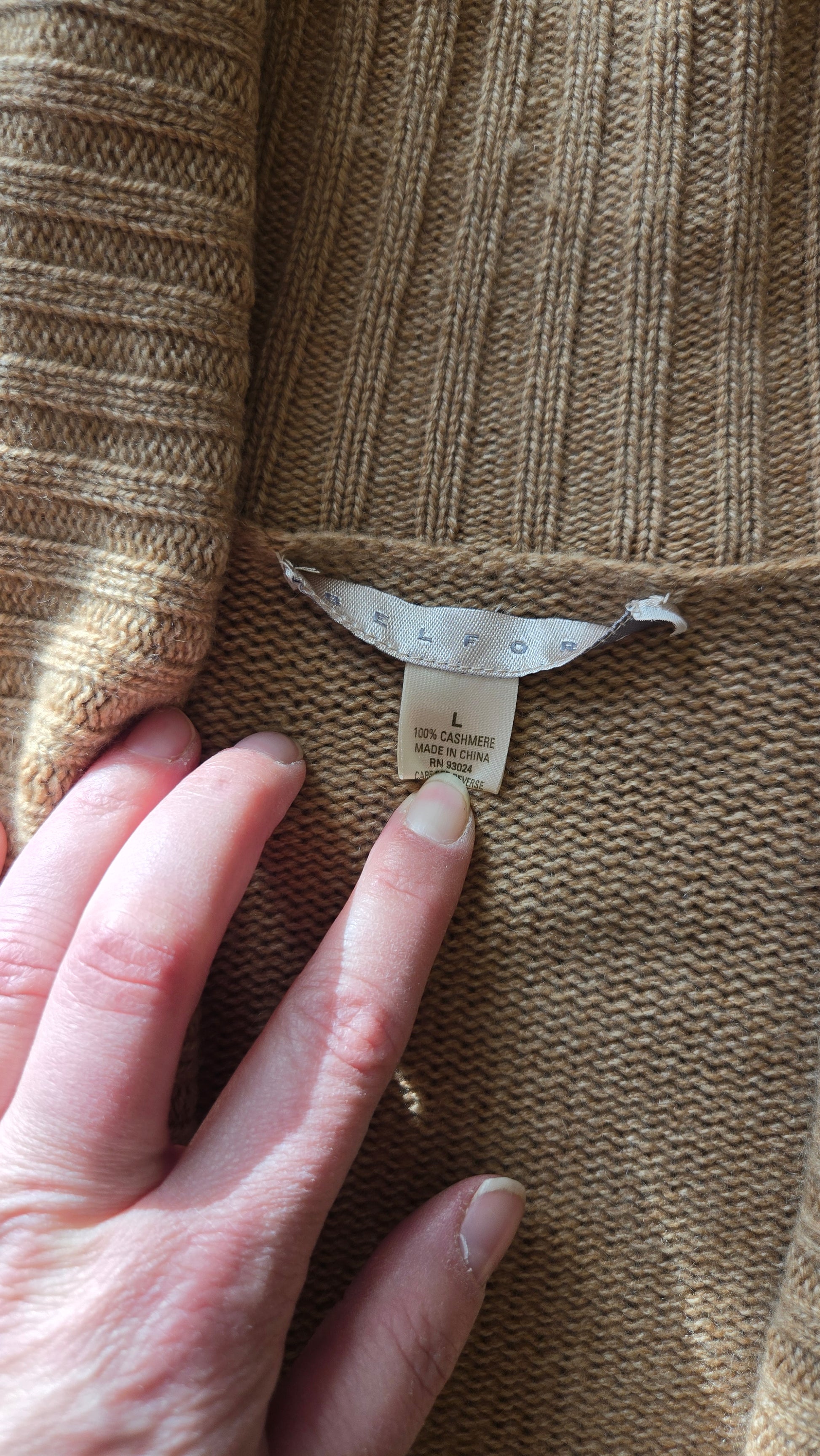 A great camel 100% cashmere sweater to throw on over a tee and feel put together. Has a shawl collar and no closures, to be worn open. Has two holes on the back right shoulder I've visibly mended with white and yellow thread.