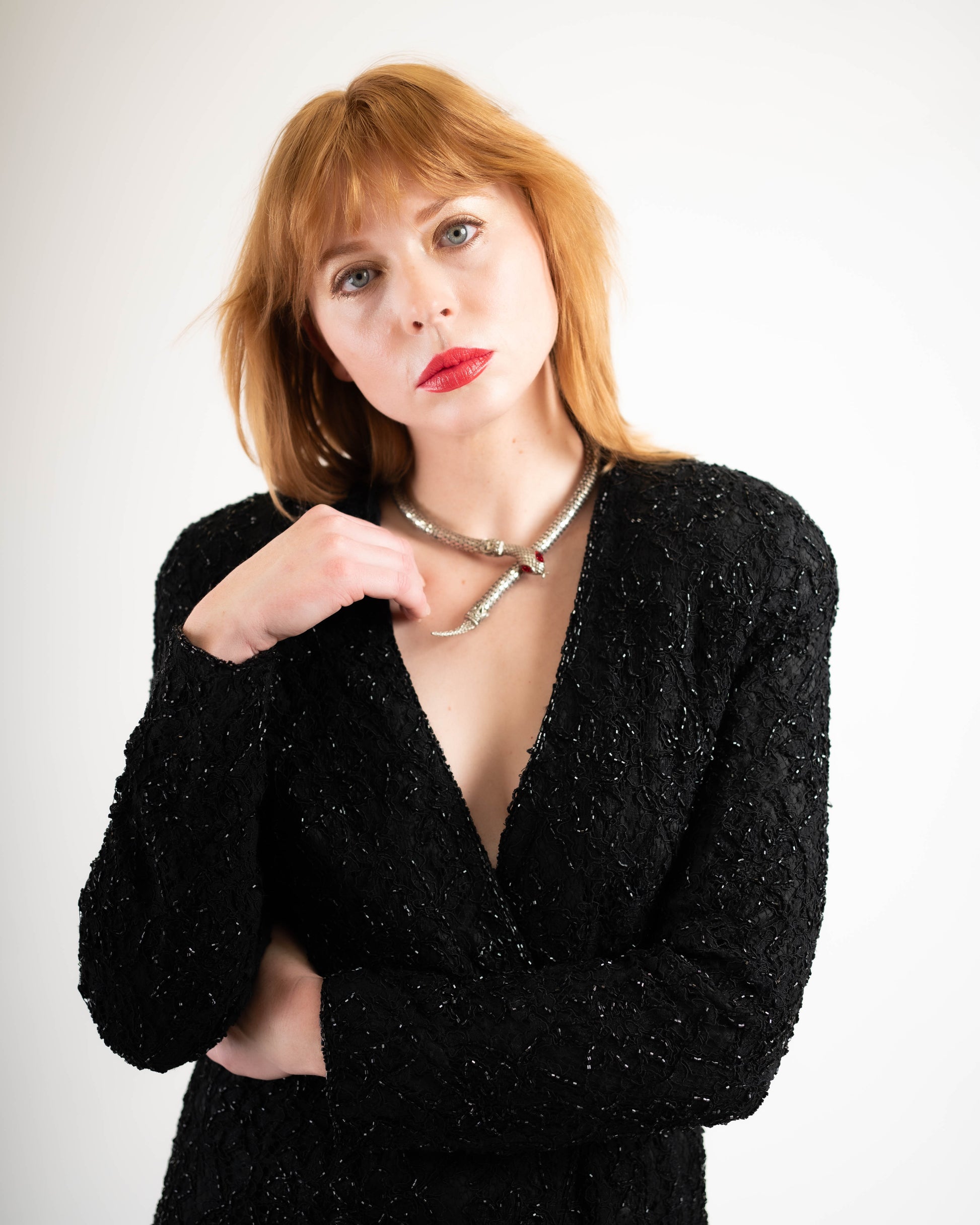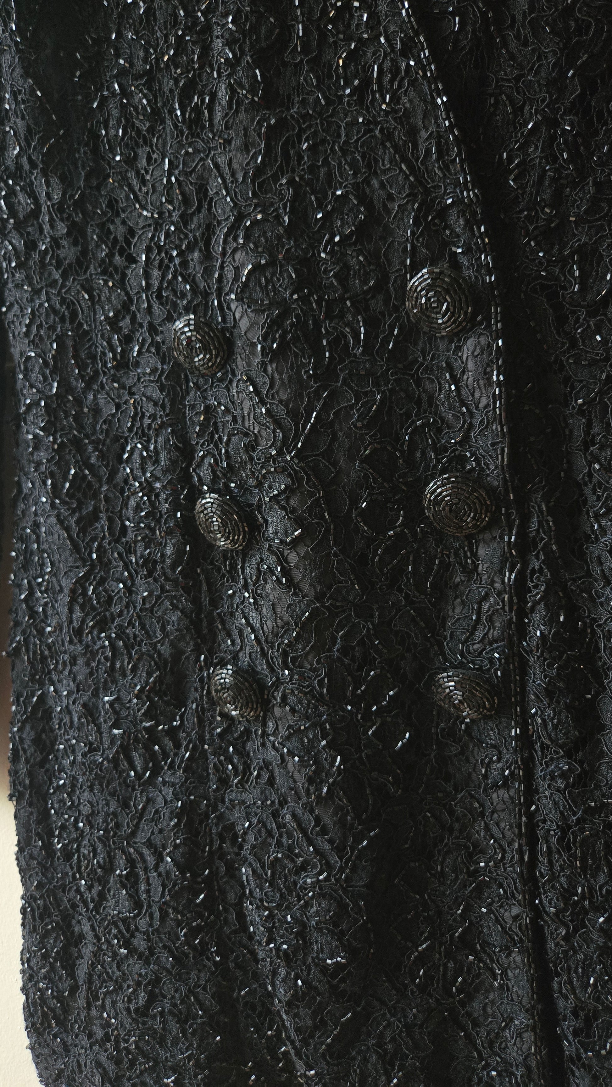 I MEAN. An insane beaded suit for anyone looking for a show-stopping look that can be worn a litany of ways! The blazer is heavy with a deep, deep V, double-breasted cut, and fully lined. The matching pants are as beaded with a short-length lining, while the rest of the pant is sheer which makes these not only very loosely sexy but also incredibly modern.