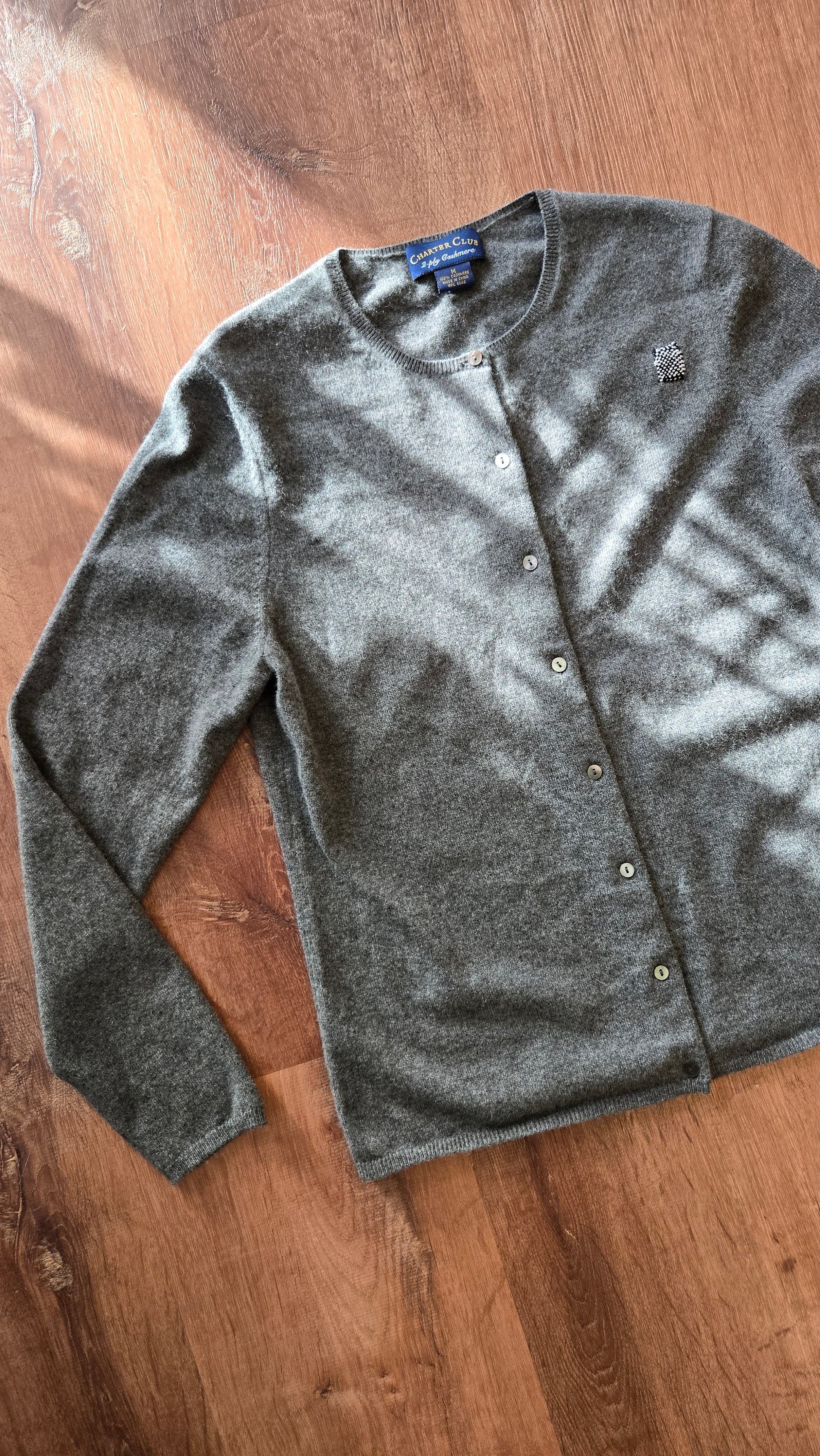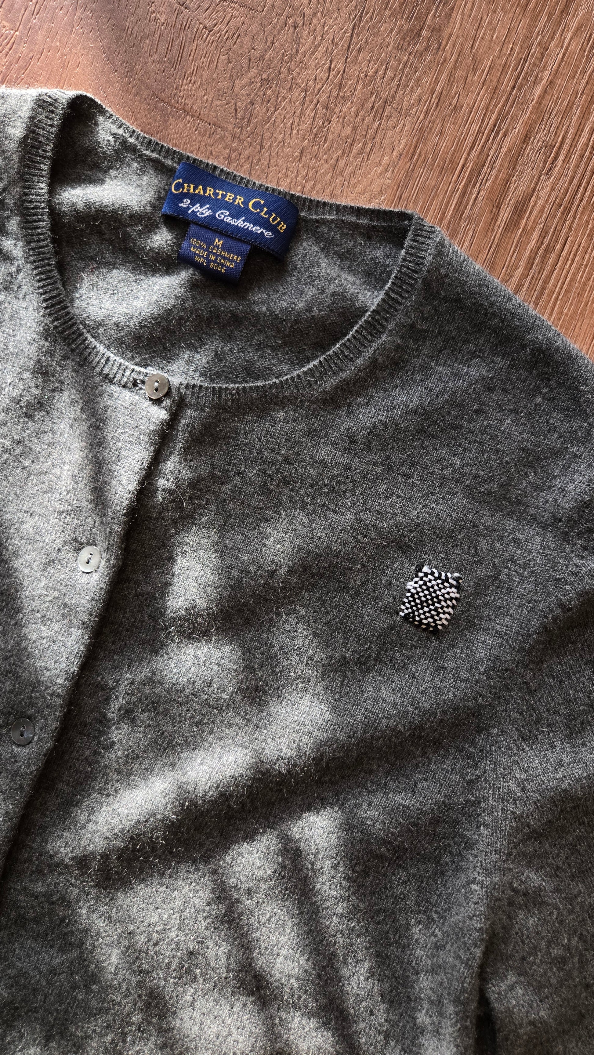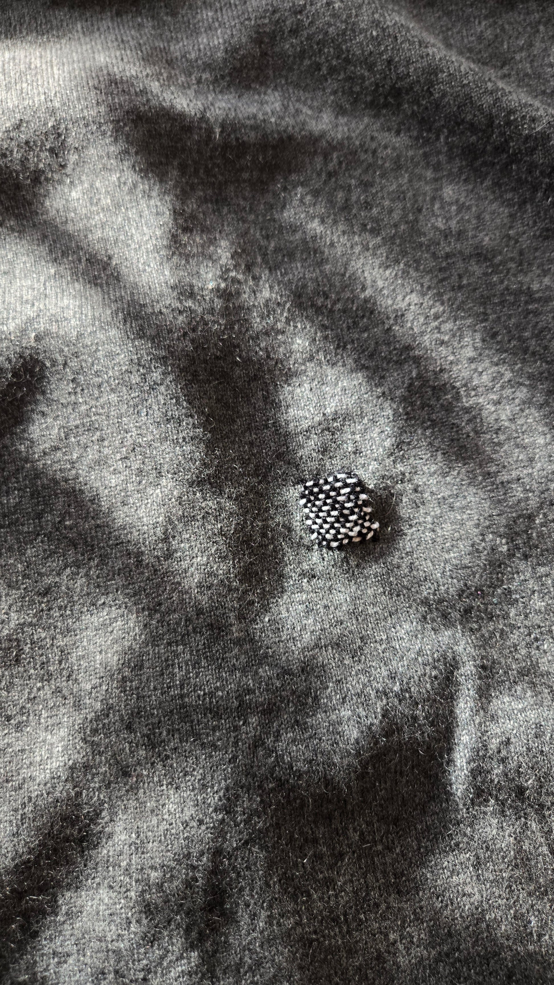An eternal classic, this charcoal grey cardigan is 100% cashmere. Would be great worn loose or tight, as a top or topper. Has two issues, one at the left chest and one on the back that I've visibly mended with white and black threads. Otherwise, perfect!
