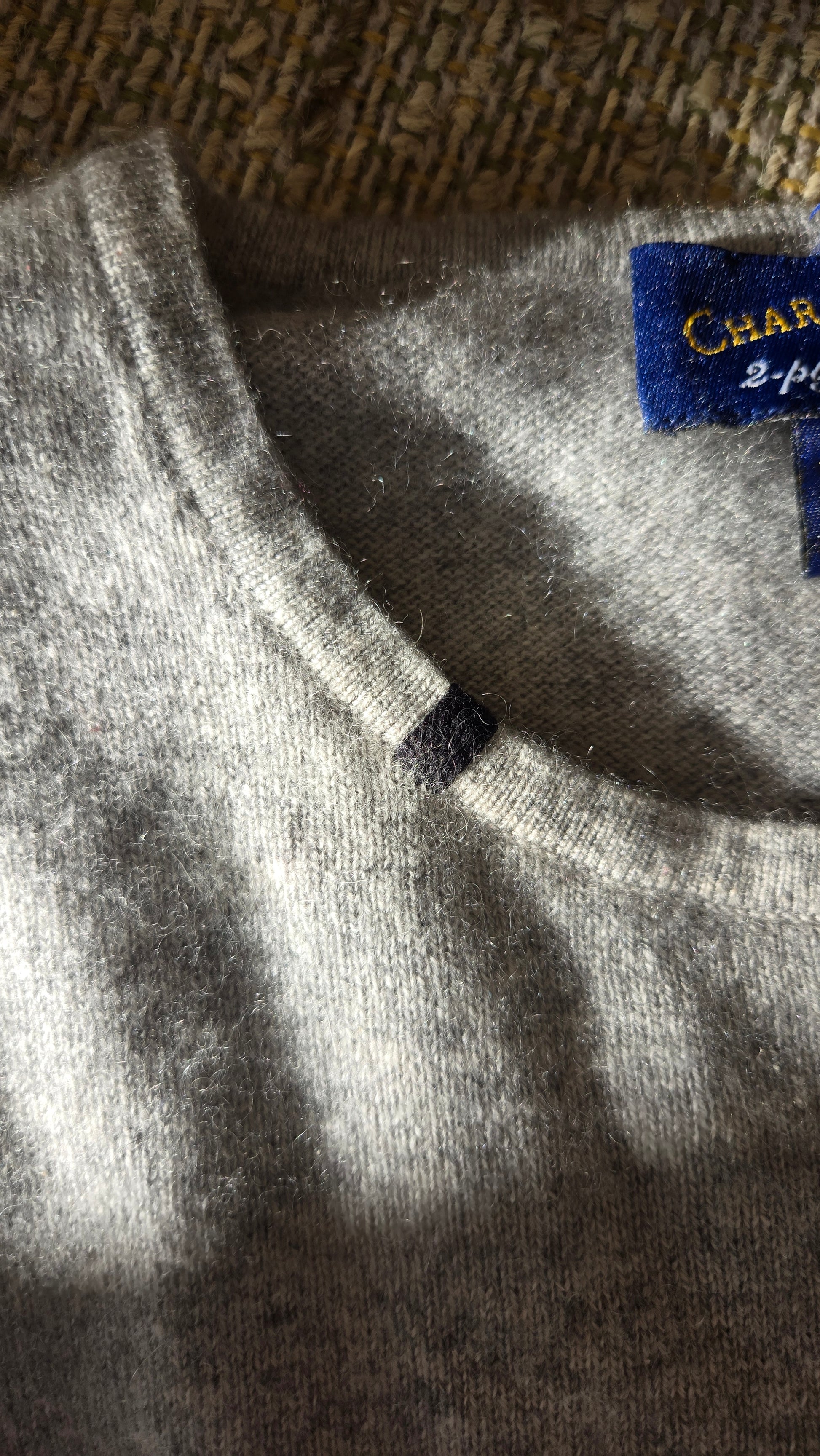 Lord I love a cashmere tee. Such a casual piece rendered in the most luxe fabric! This thin grey version is 100% cashmere and had issues at the collar which I've covered with black thread. No other issues for this closet hero.