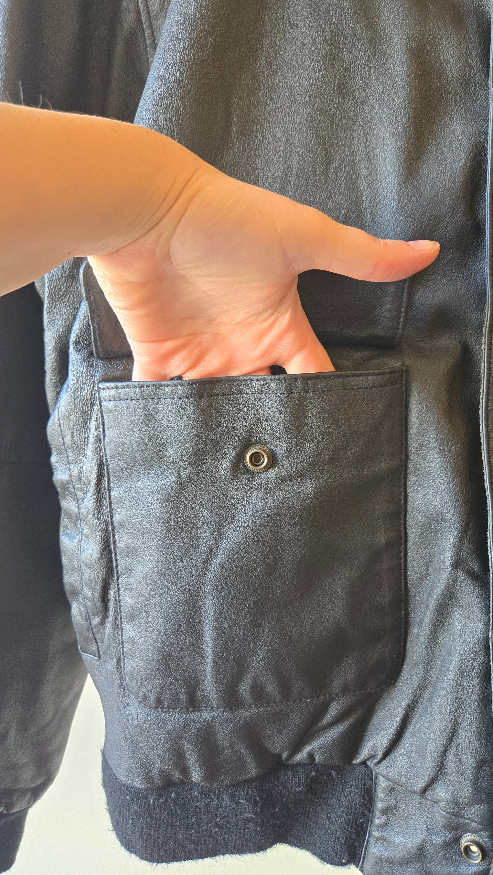 Great black leather bomber in a stiffer black leather - it doesn't seem like this has been worn at all! Has shoulder epaulettes, a covered zipper placket, and four pockets on the front: 2 flap and then two slit. The lining is killer and is a giant map! In great condition.