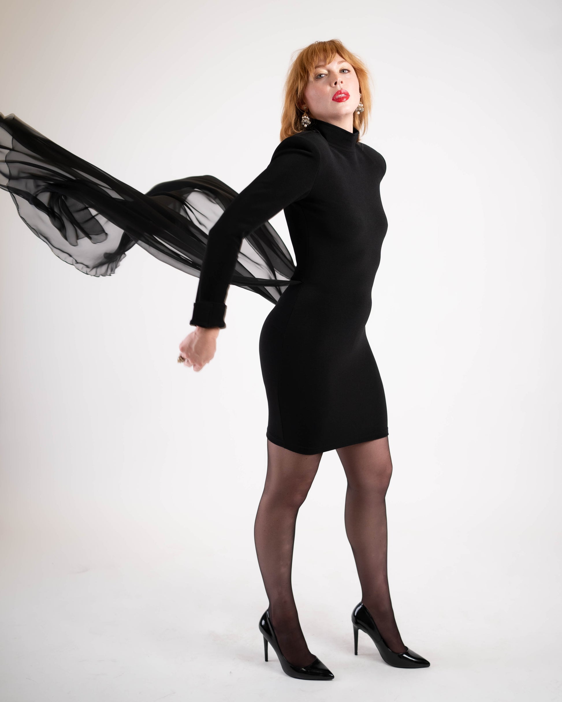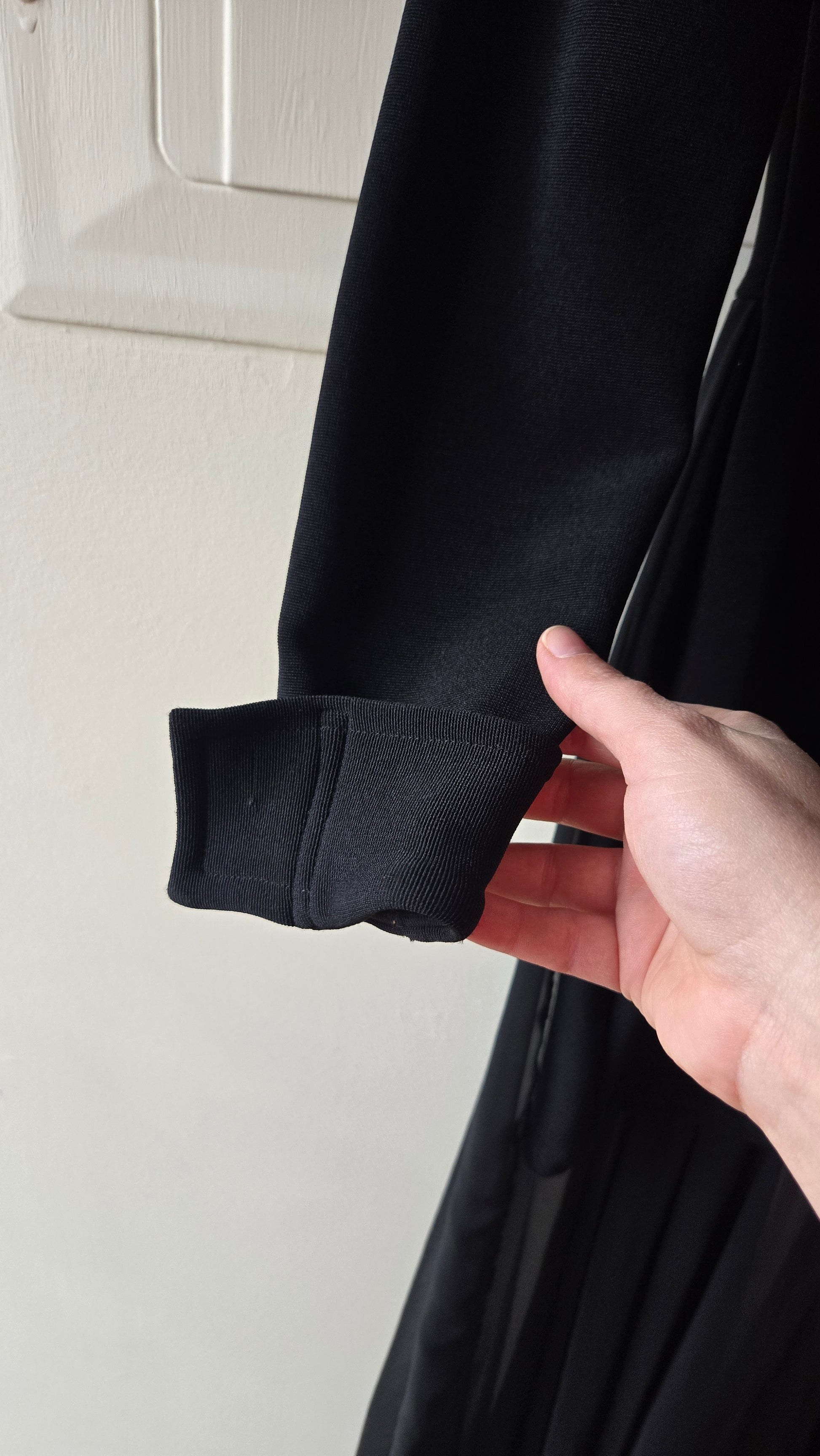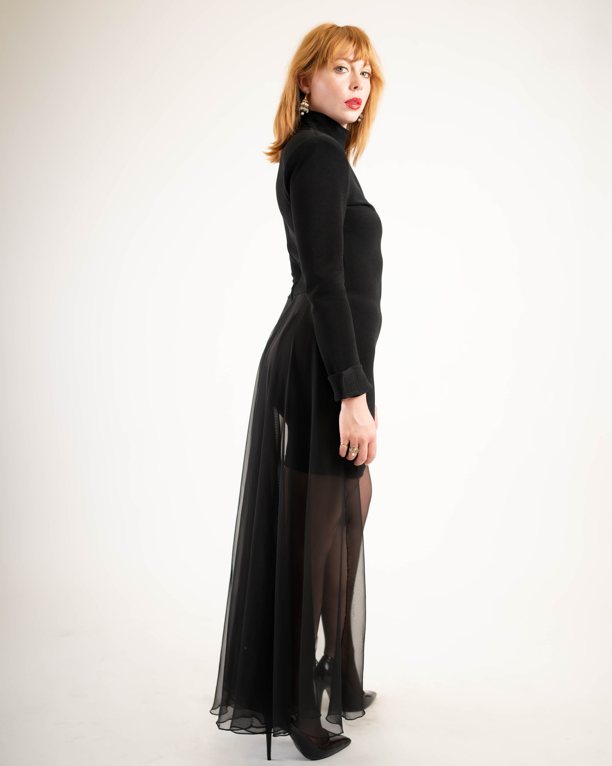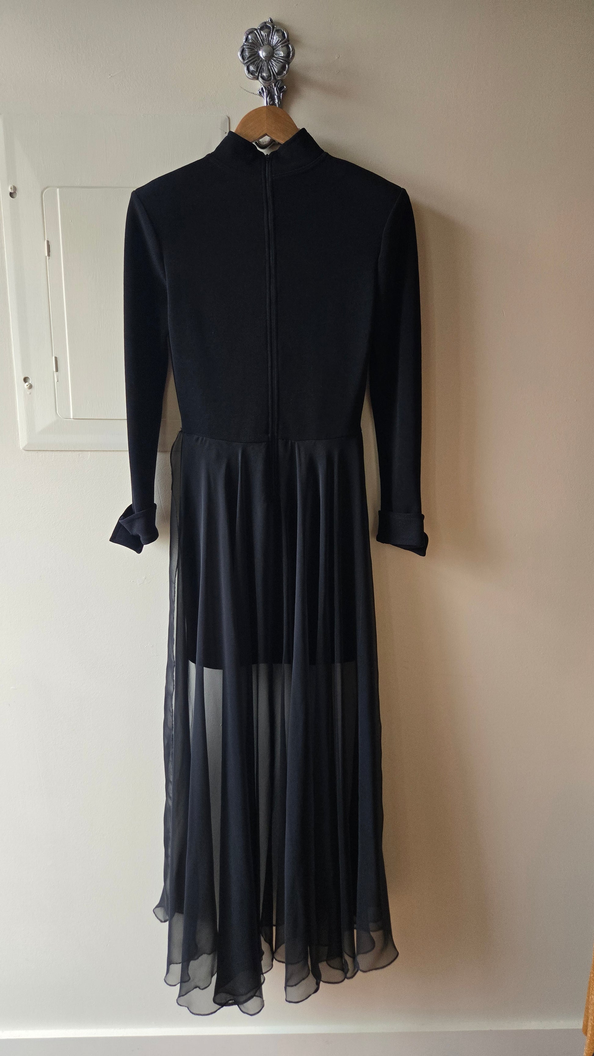 THIS DRESS. This needs to go to either someone who loves to make an entrance or a goth little bride!! The body of the dress is pretty classic, with a mock neck and cool cuffs. the dress itself has some stretch but the fabric is thick so it really holds you in , in a very comfortable way. But let's get to the train. The TRAIN. Amazing. It starts at the waist and flows all the way down the floor. Anytime you take a step, this gal will flow right behind you. A really, really, special piece of vintage!