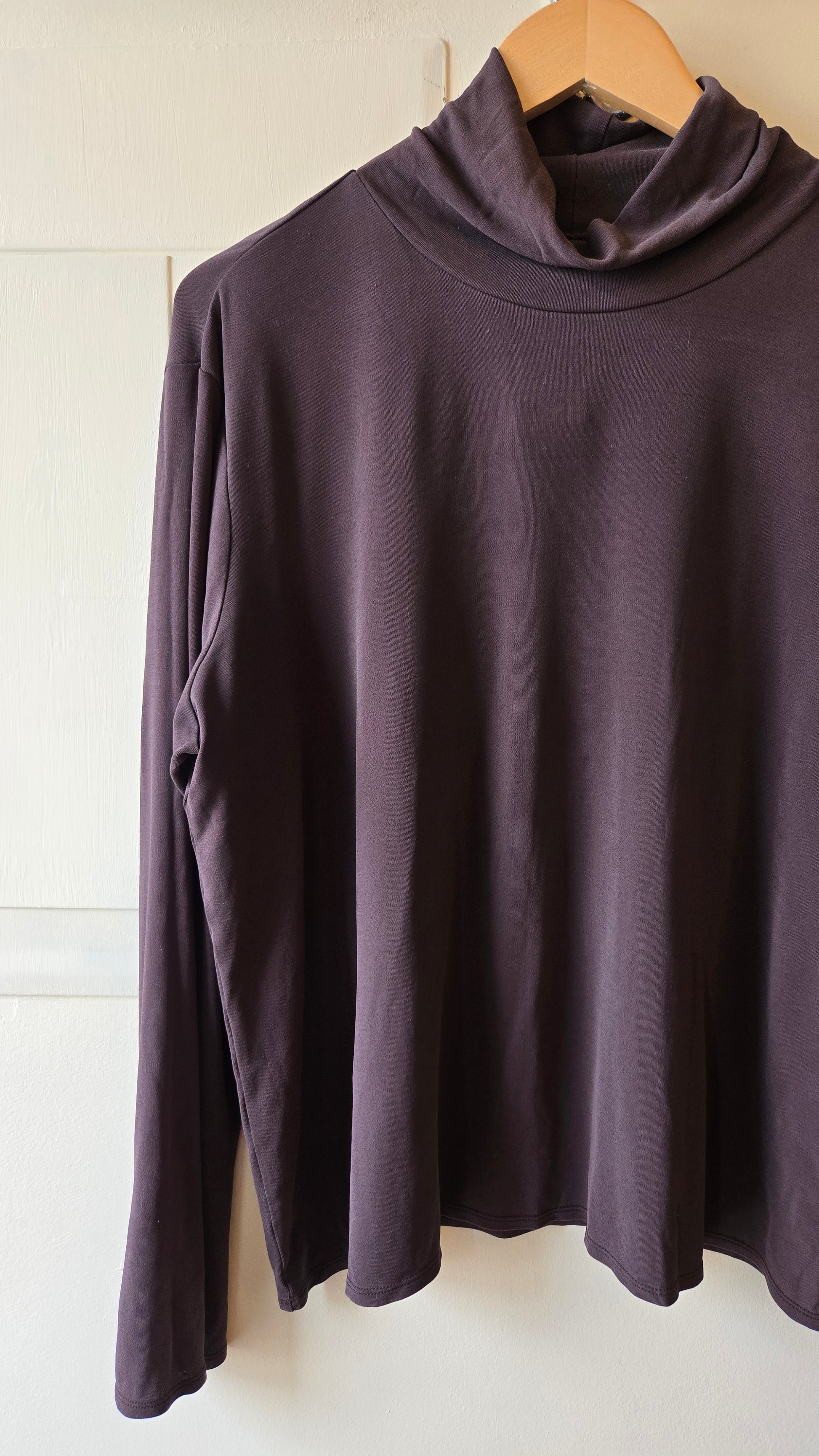Silk and slinky turtleneck, perfect for layering or just tucked into jeans. Is a kind of dark taupe or blue-ish brown color.