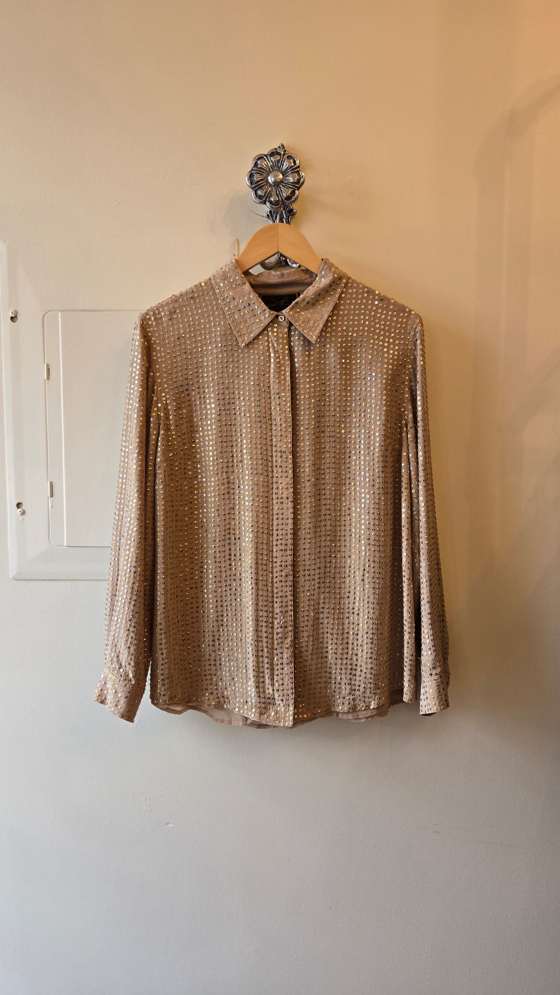 This color combination is so intriguing. The beige silk background playing as stage to the gold iridescent sequins will make every light in the room shine off of you and every head in the room turn your way. Love this with just a pair of jeans or how about with a gold skirt??