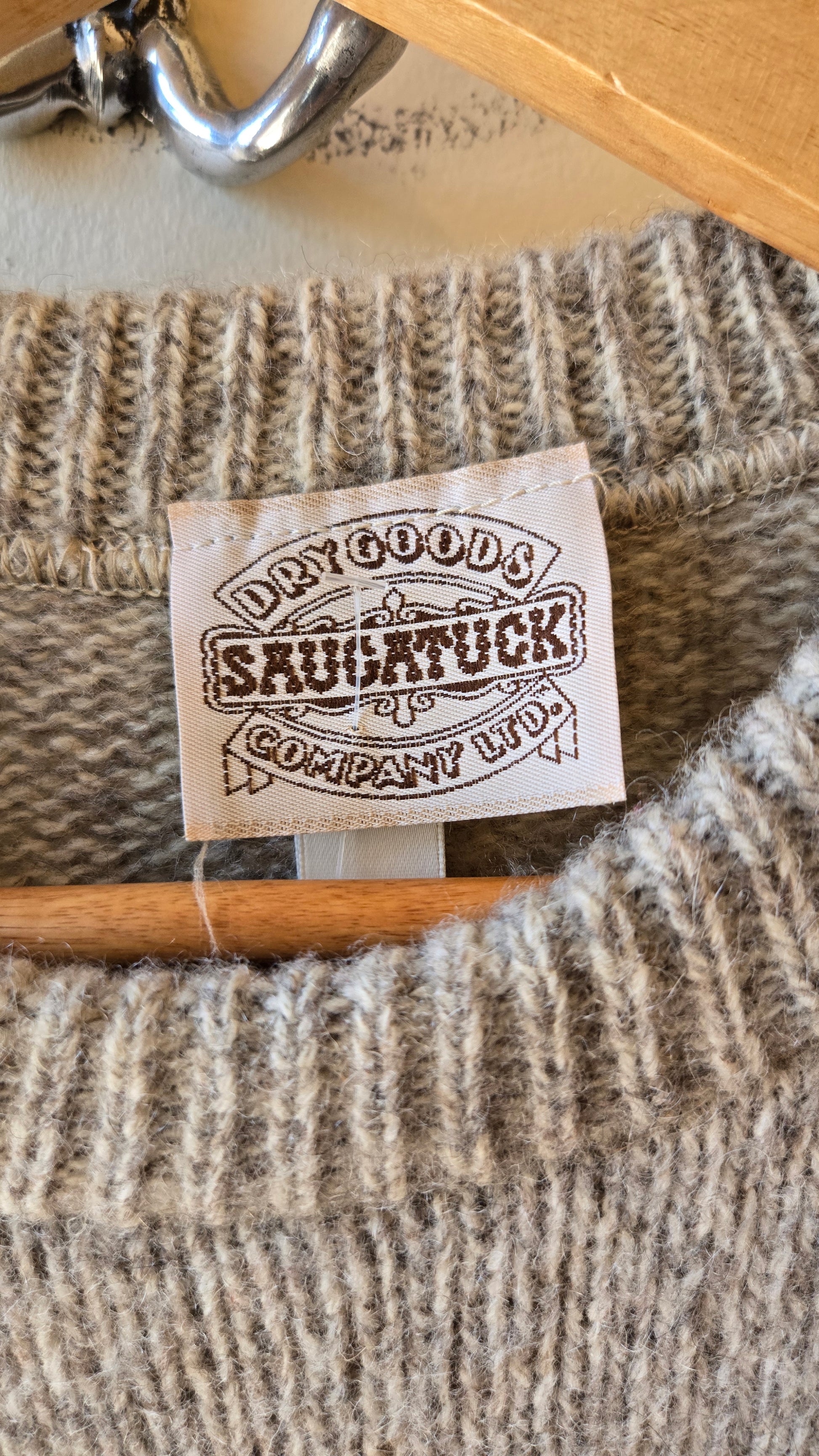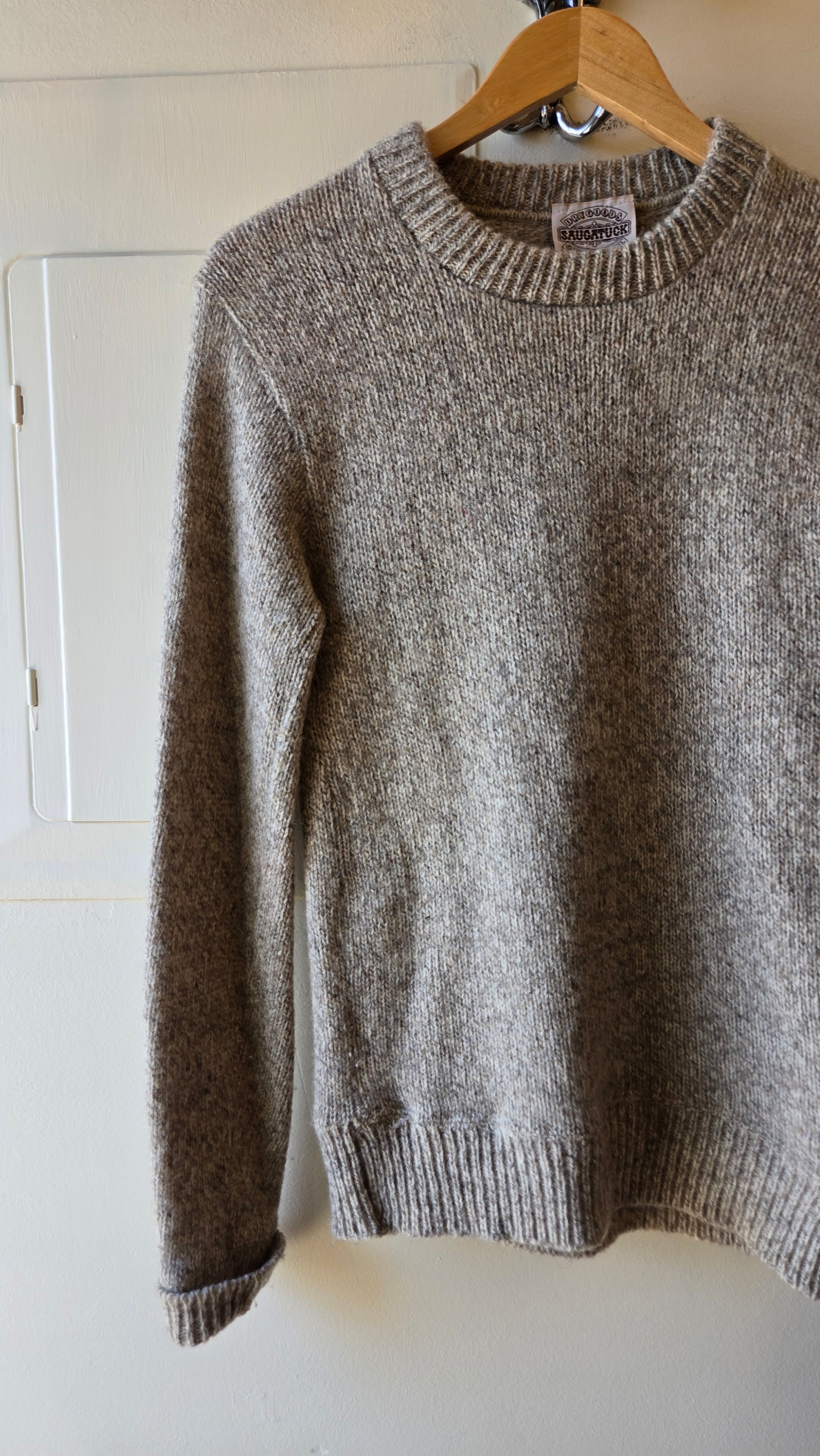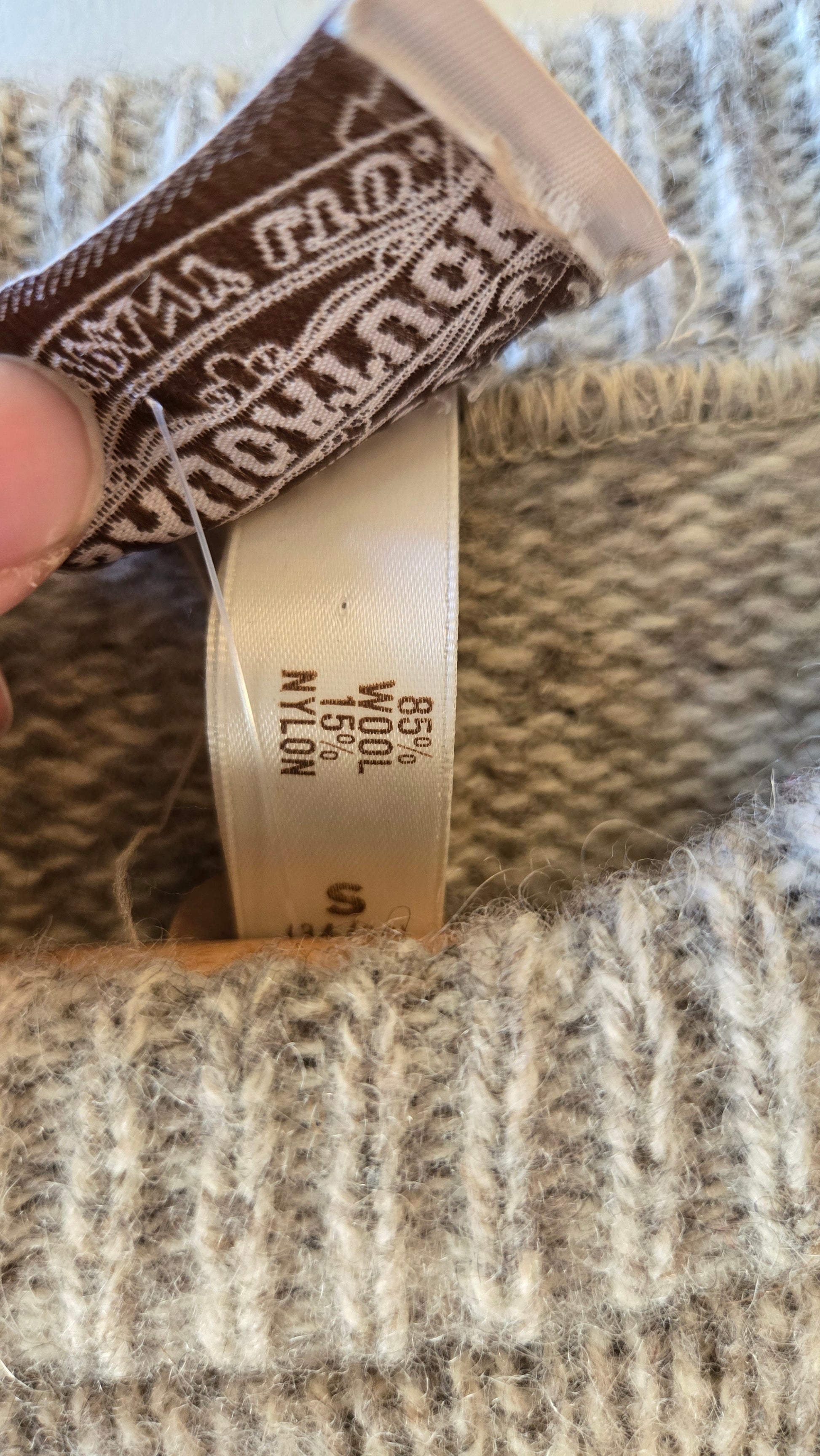 Slim-cut, heathered taupe wool sweater with cuffed sleeves. Such a classic and just needs a chunky scarf and some wool pants to pair with it!