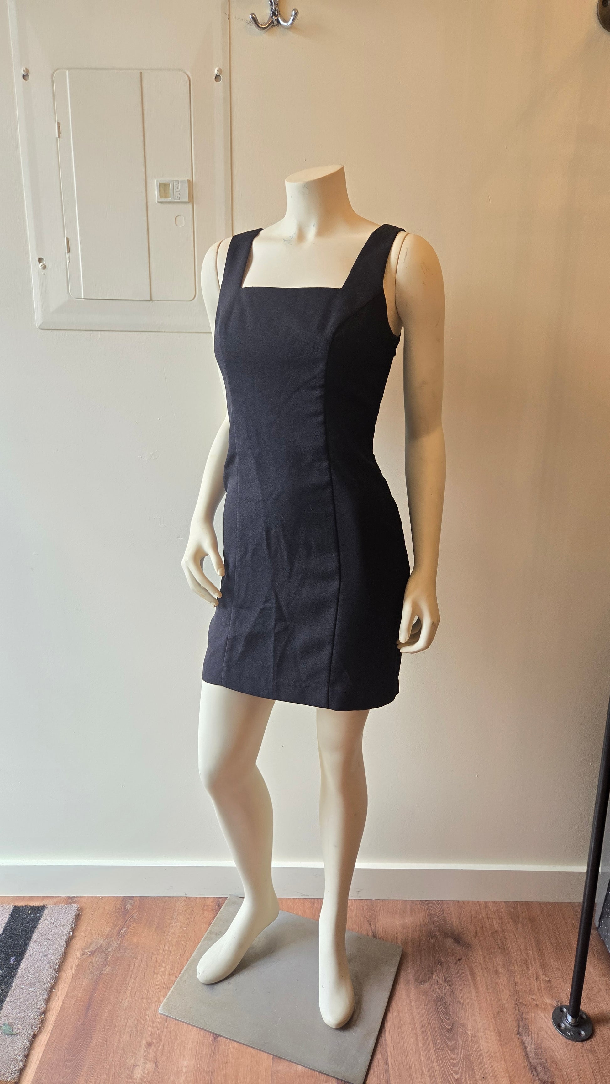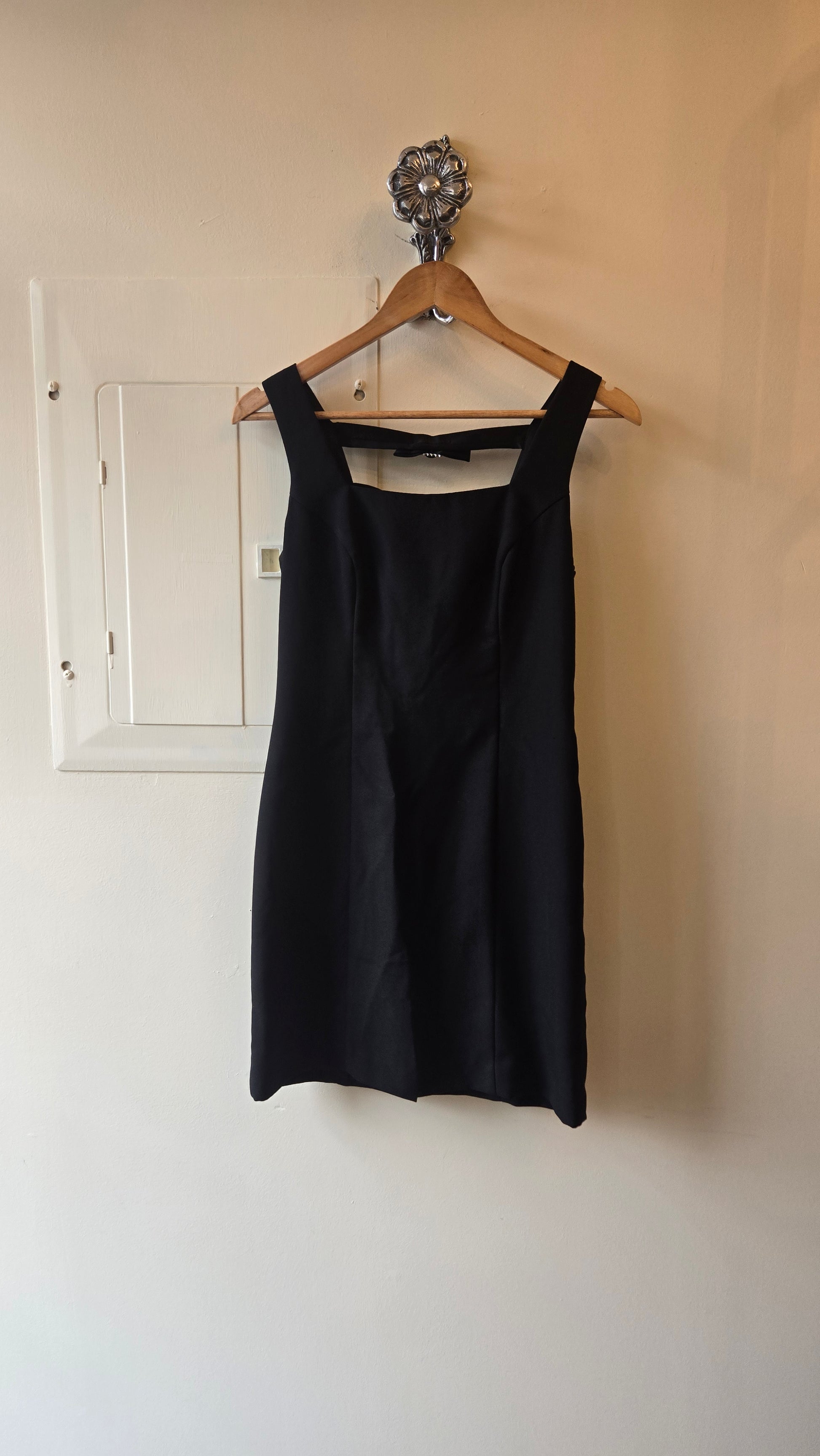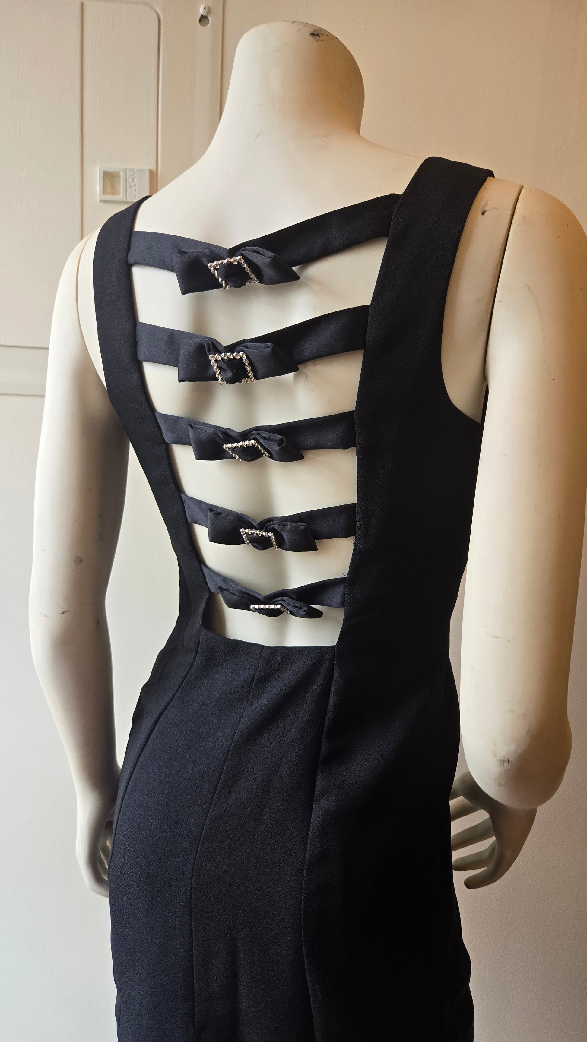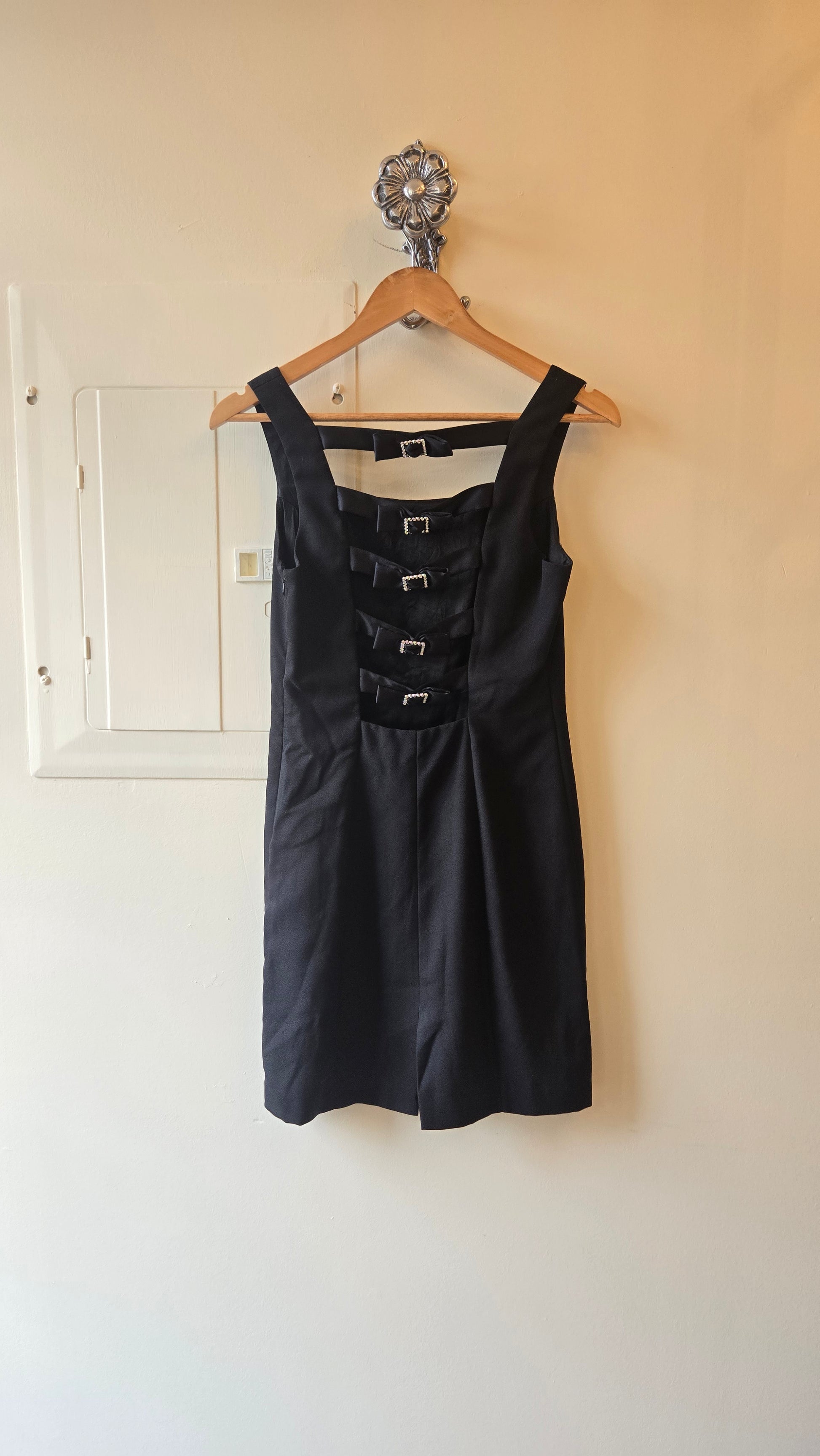 The epitome of a 'walking away' dress. Simple and chic from the front and a big, joyous party in the back! Fully lined with side zip, the strappy back with rhinestone buckles and bows is what makes this. Needs some sheer tights and big rhinestone earrings!