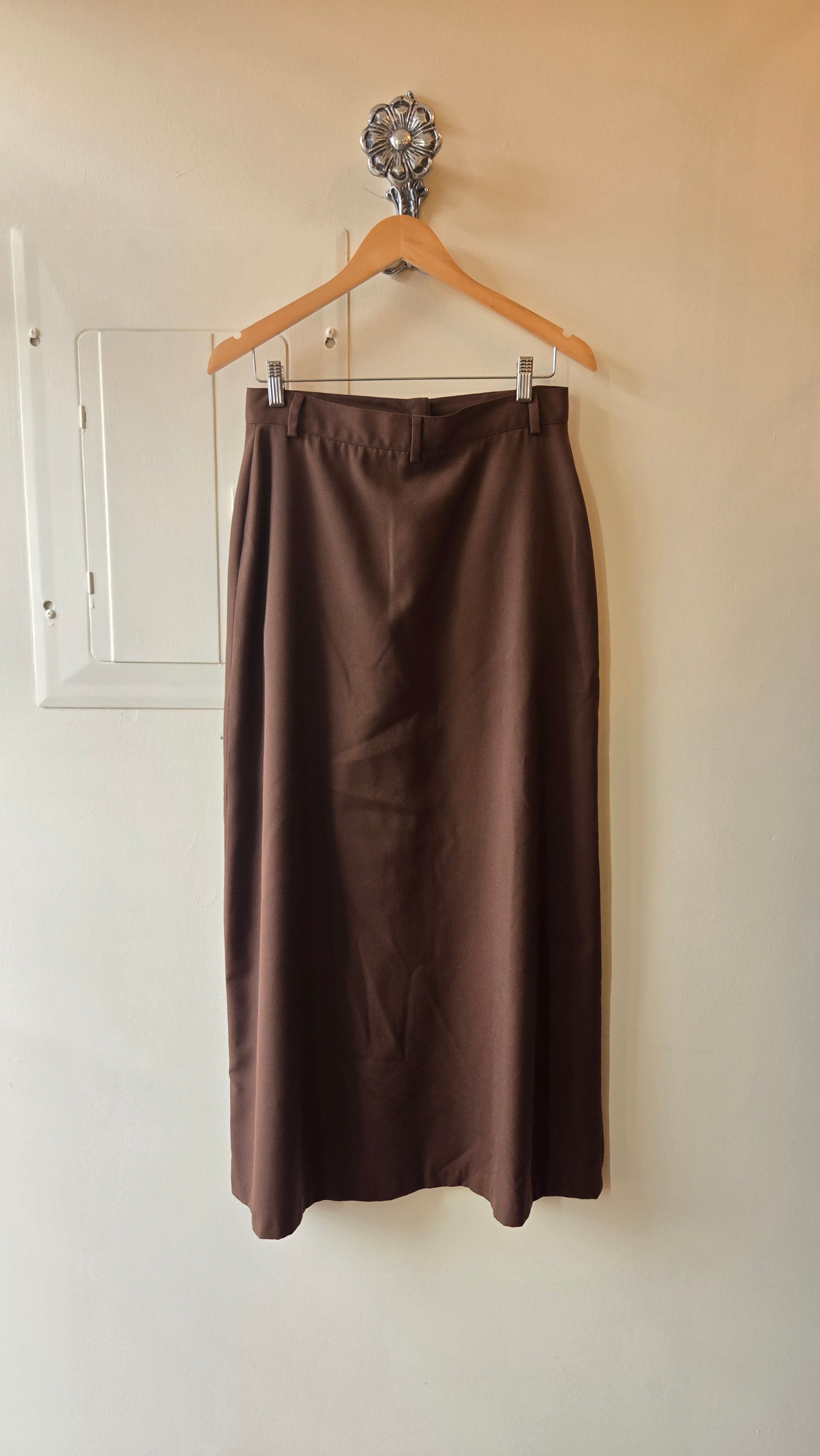 The best chocolate-y brown skirt in a maxi length. What I love so much about this one is that it's cut at the top like a jean, with the same button and zip placket and two side pockets. Simple, but effective. It's unlined with no slits. With some even darker brown suede boots underneath? Divine.