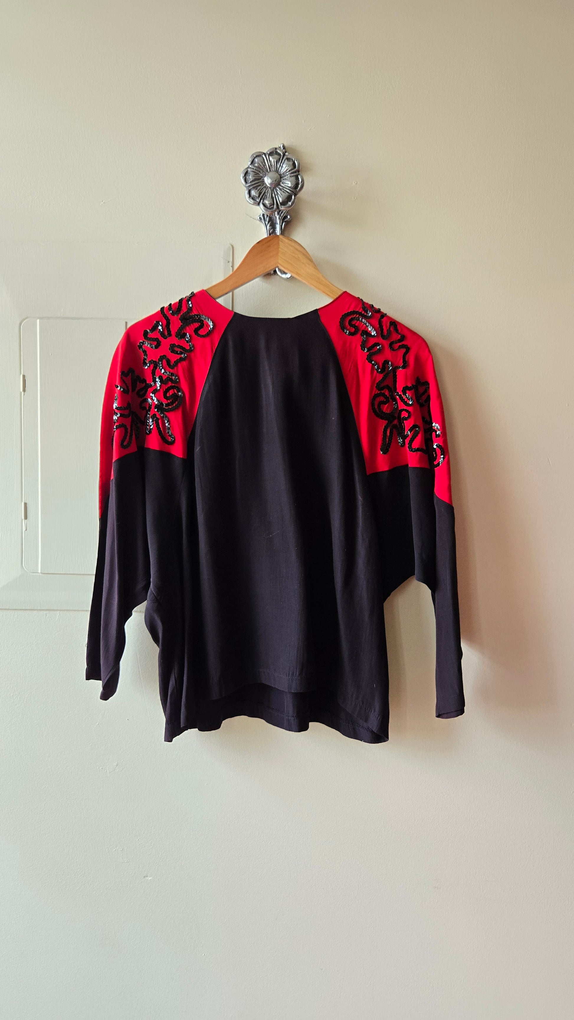 Fun little party top! Black top with red sleeves covered in soutache-style sequins. With exaggerated dolmain sleeves, this top is almost like bat wings! Would tuck this into some black velvet pants.