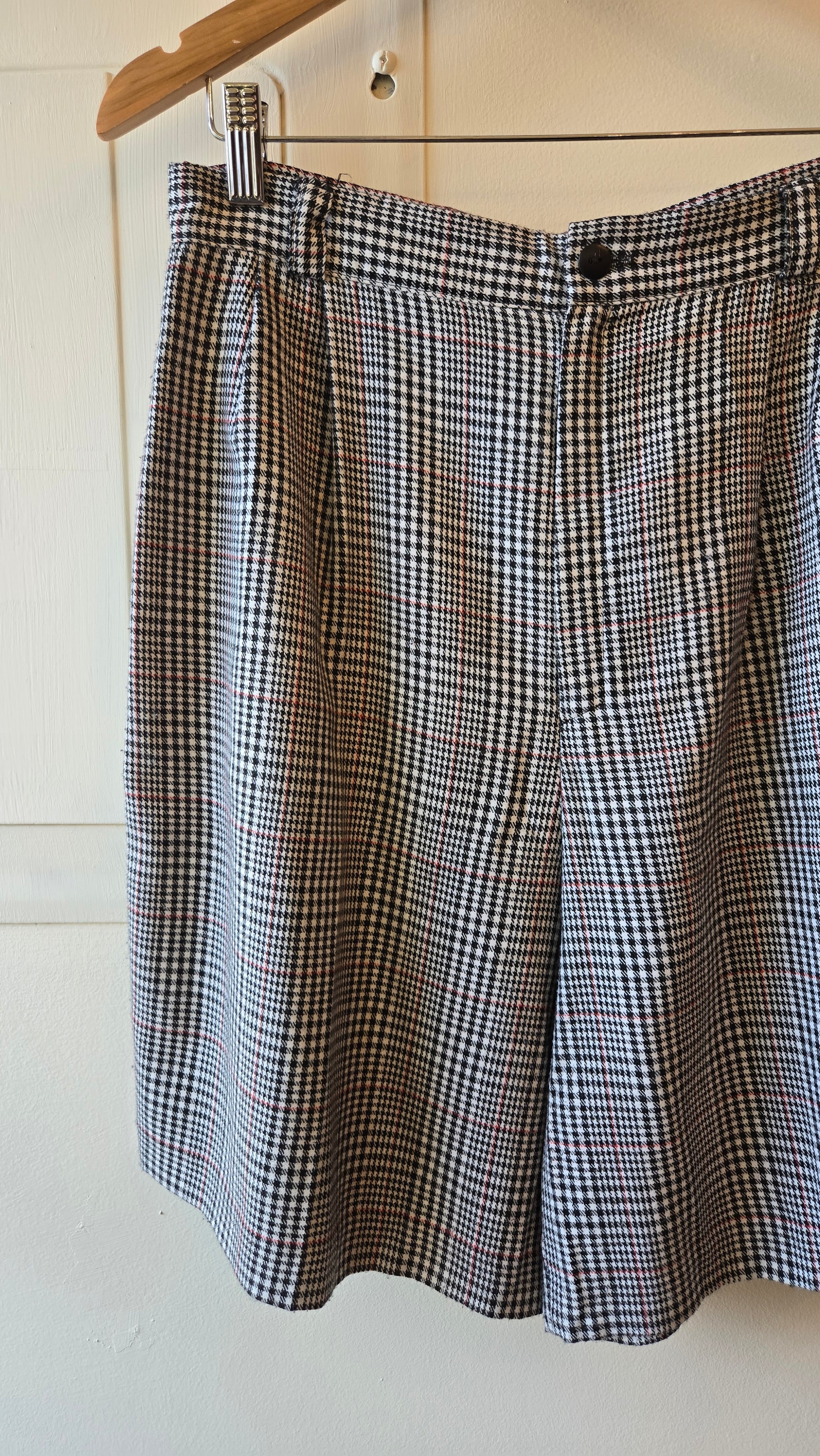 LOVE these kinds of shorts for fall - there are few in the collection! With a sheer tight and some knee-high boots? Perfection. These are a small black, white, and red houndstooth with a high waist and wide-cut leg. No back pockets, but does have two hip pockets. Unlined!