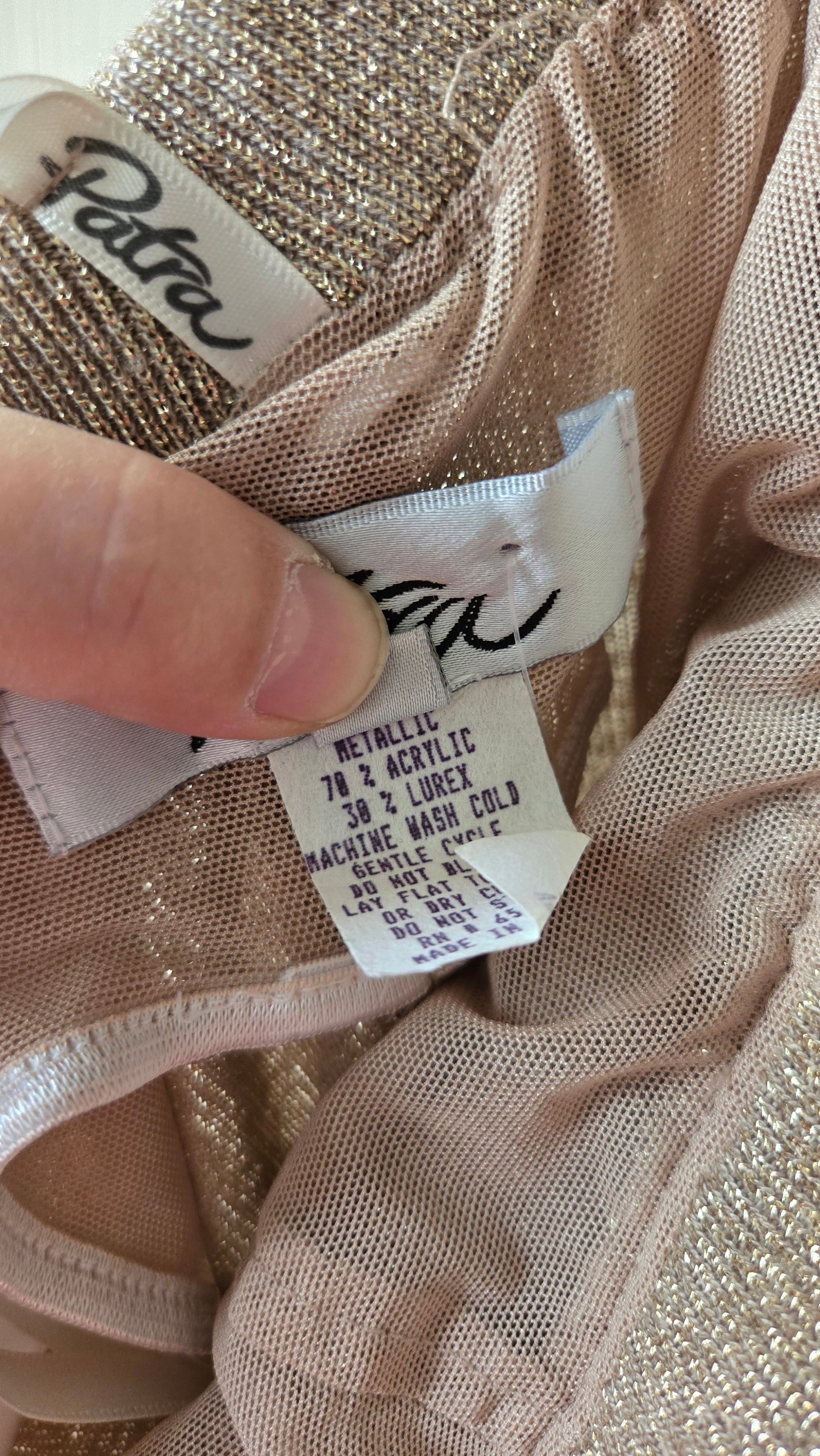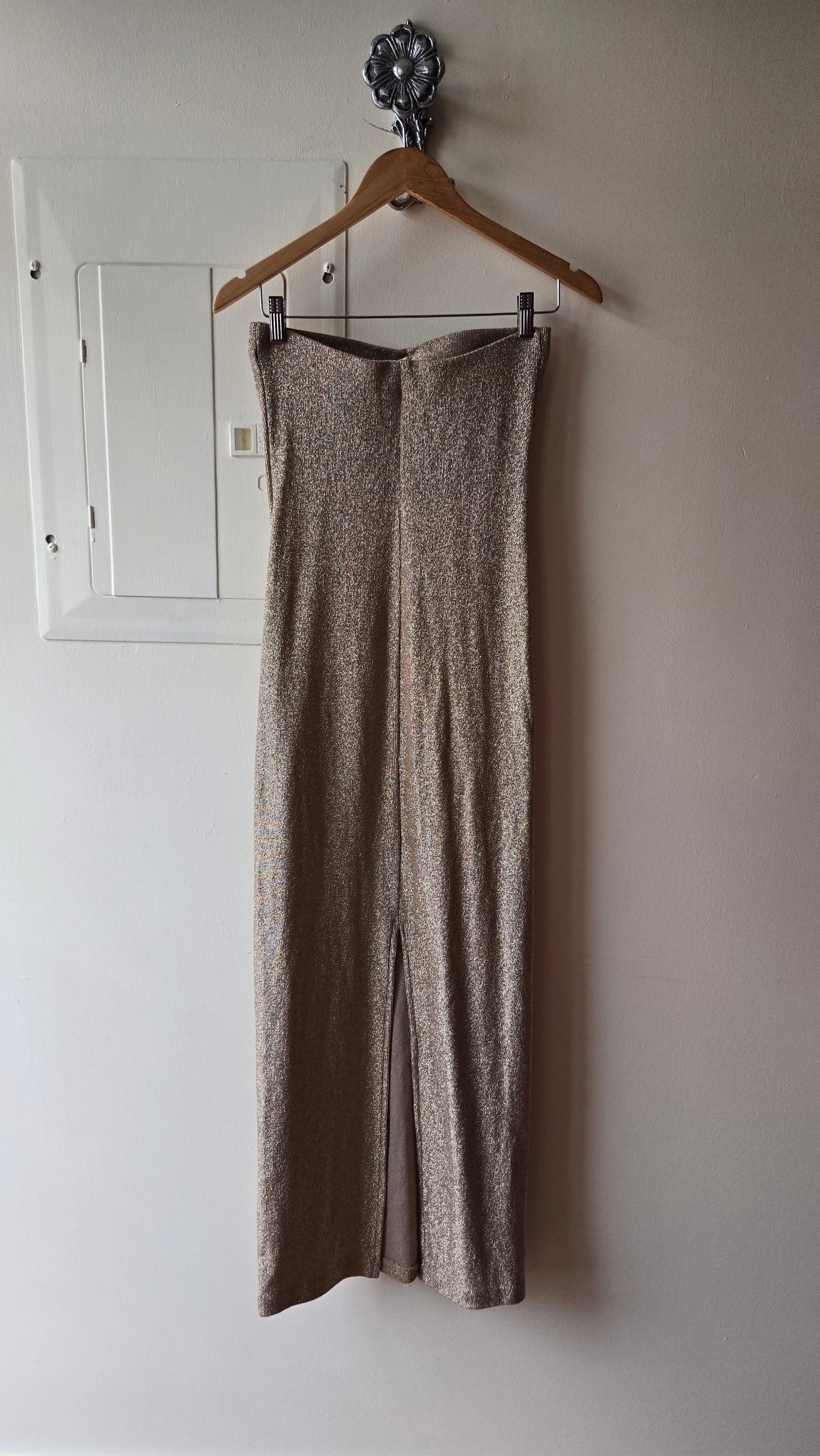 I MEANN. What an unexpected and cool gown! A classic tube dress, the bust hem has elastic to keep the dress up, while the rest of the dress is unlined. Love how simple this is and it's just your bod making it sing! This is super stretchy, but will show every curve, so keep that in mind! Has a subtle shimmer to it and a nice slit up the back for movement. Has a matching cardigan (not pictured but included in purchase)!