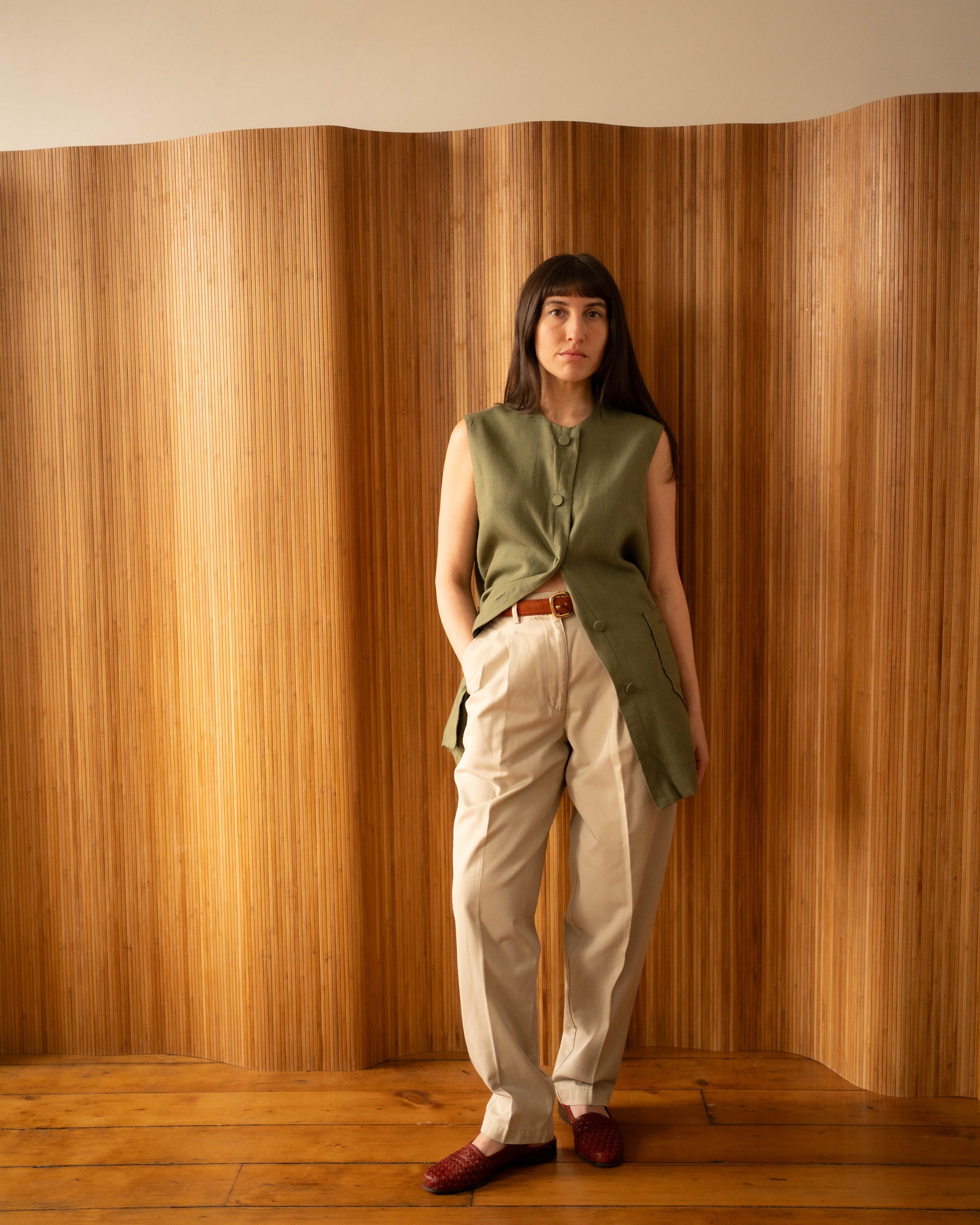 Hard to beat the eternal mom-coolness of a pair of tapered khakis. Especially when paired with a tunic vest that will turn heads. 100% cotton, and begging to be worn all spring with just a white tank and a belt and all fall with chunky cotton turtlenecks, you can't lose with these bad boys.