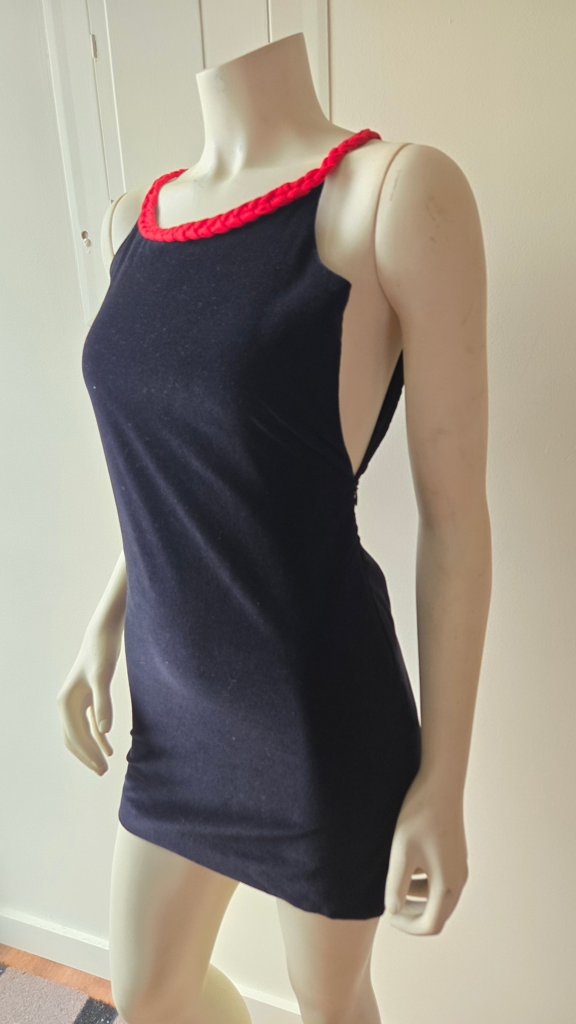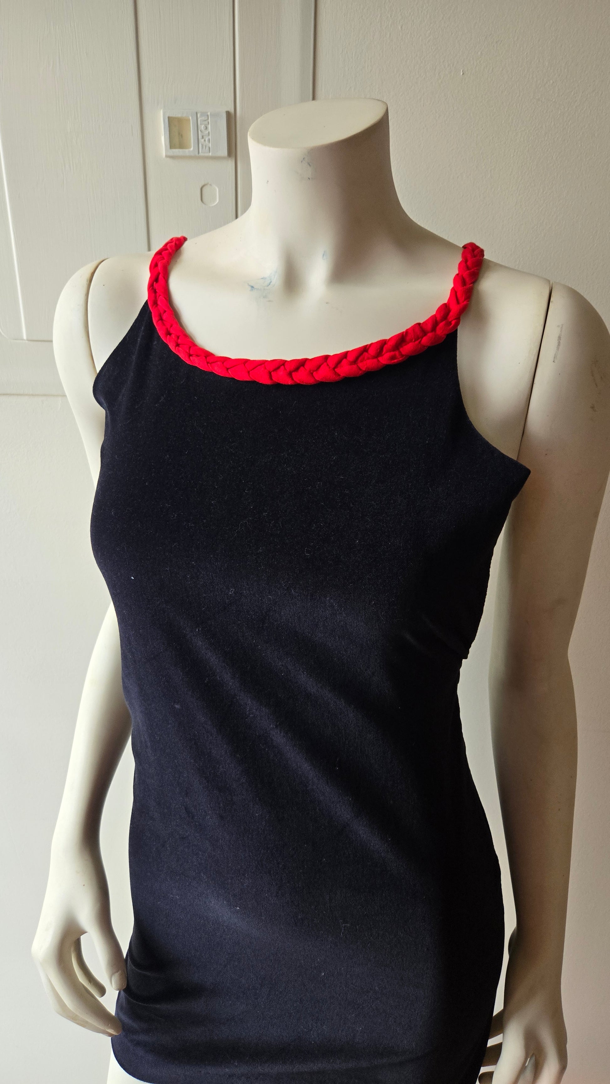 How fun is this simple but sweet combo? The braided red trim is just enough of a punch to balance the black velvet body. Fully lined with a side zip, this would be adorable with sheer polka dot tights and strappy heels!