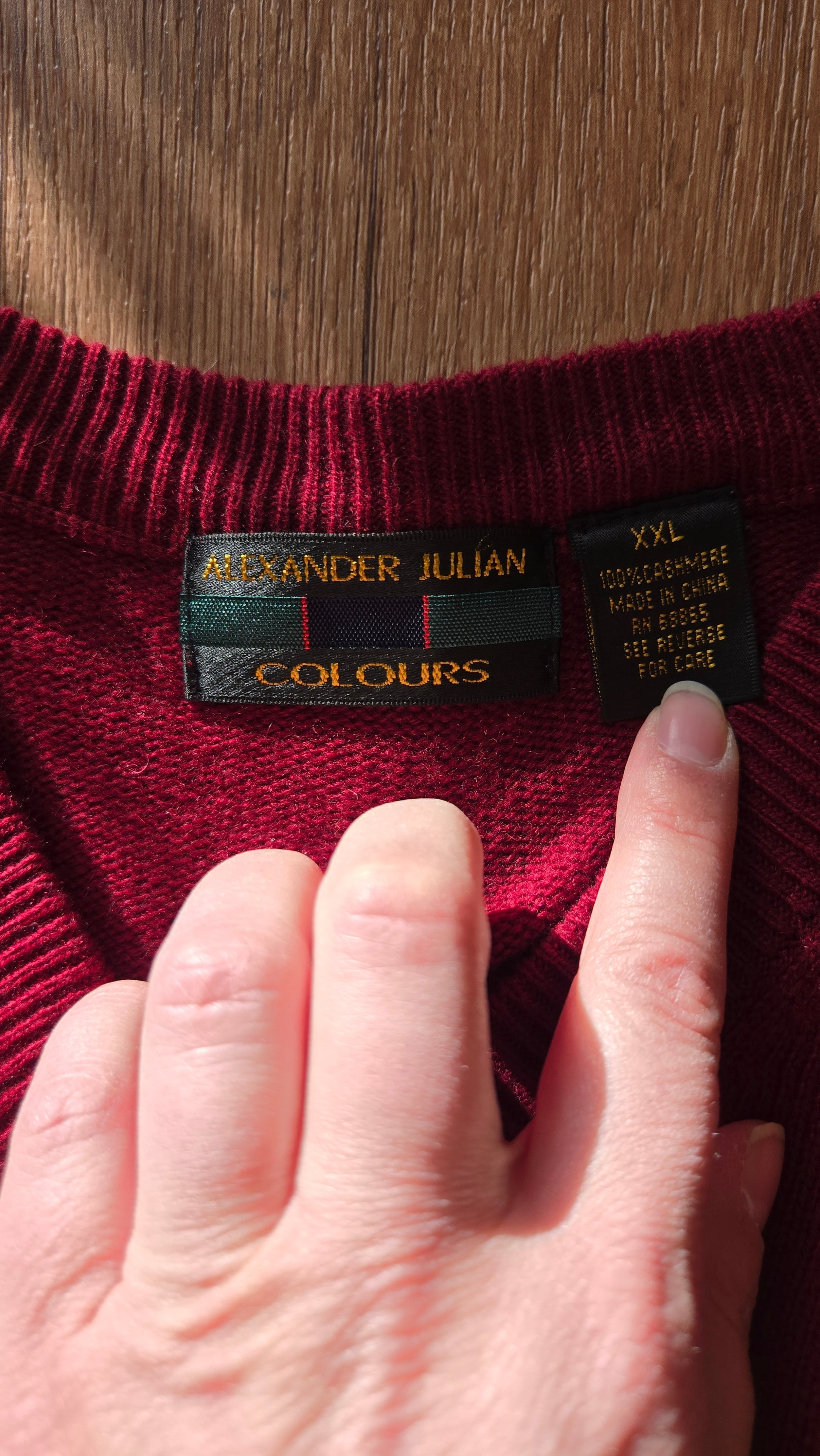 Autumn in a sweater! This gorgeous wine-hued v-neck sweater is 100% cashmere and and oh-so soft. Needs a nice fall walk in a park, I'd say. Had two holes at the left shoulder and right sleeve that I've visibly mended in red & blue threads. Very seriously considering keeping this one...