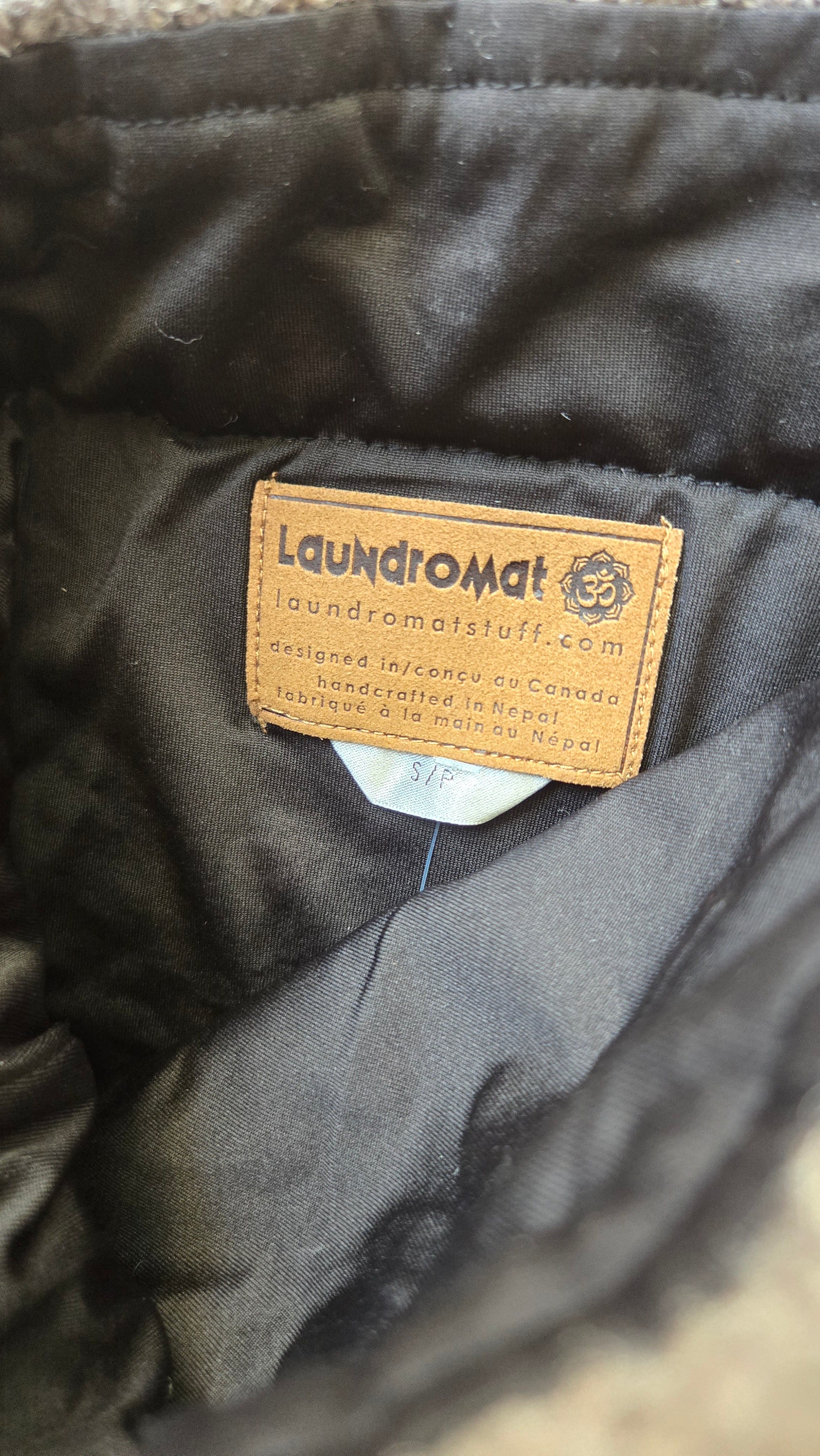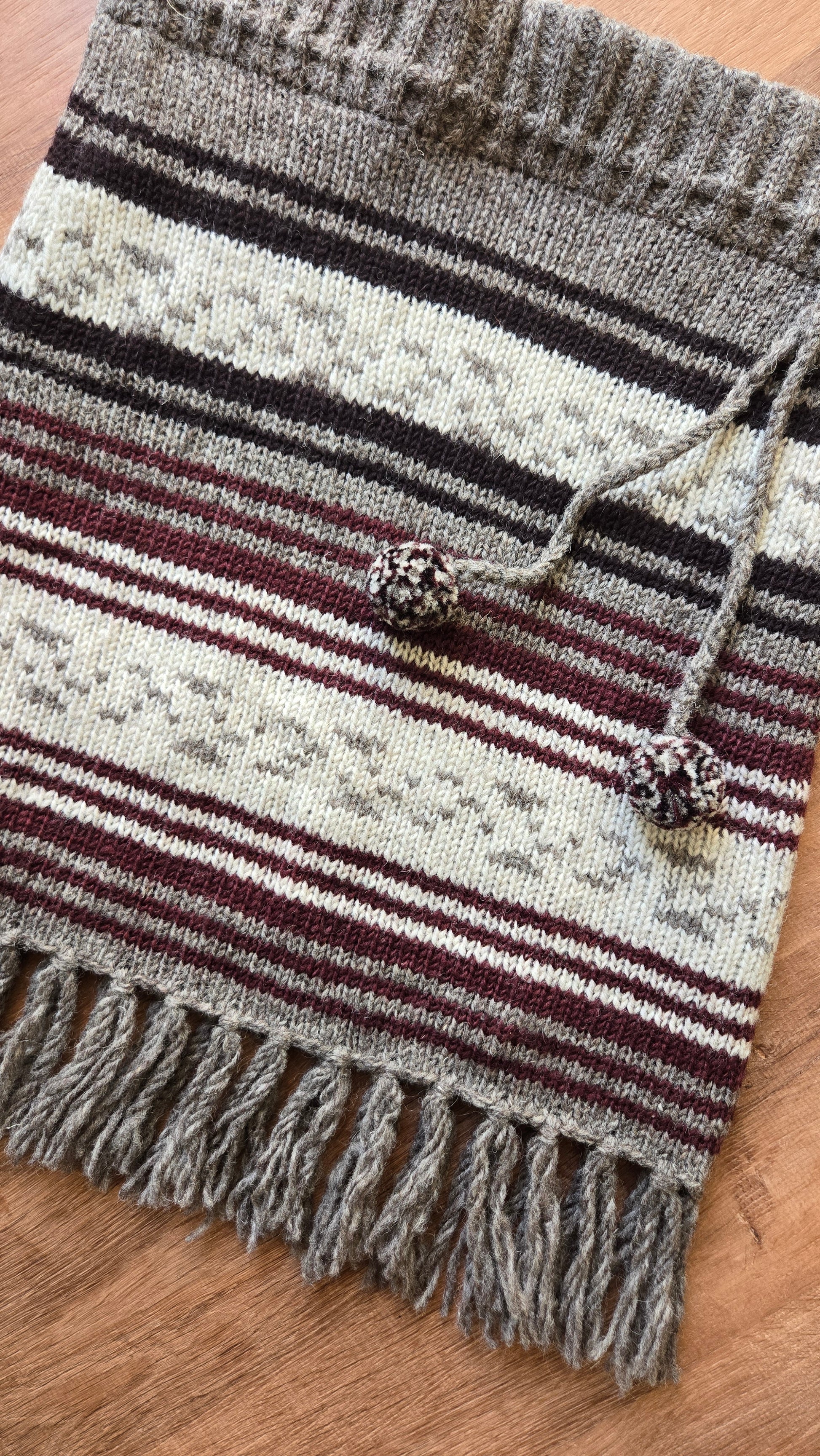 How fun is this?! Designed in Canada and made in Nepal, this sweet sweater skirt is a grey/ivory/plum/light black stripe with an elastic and drawstring waist that ends in two cute pom poms. Fully lined with fab fringe at the bottom.