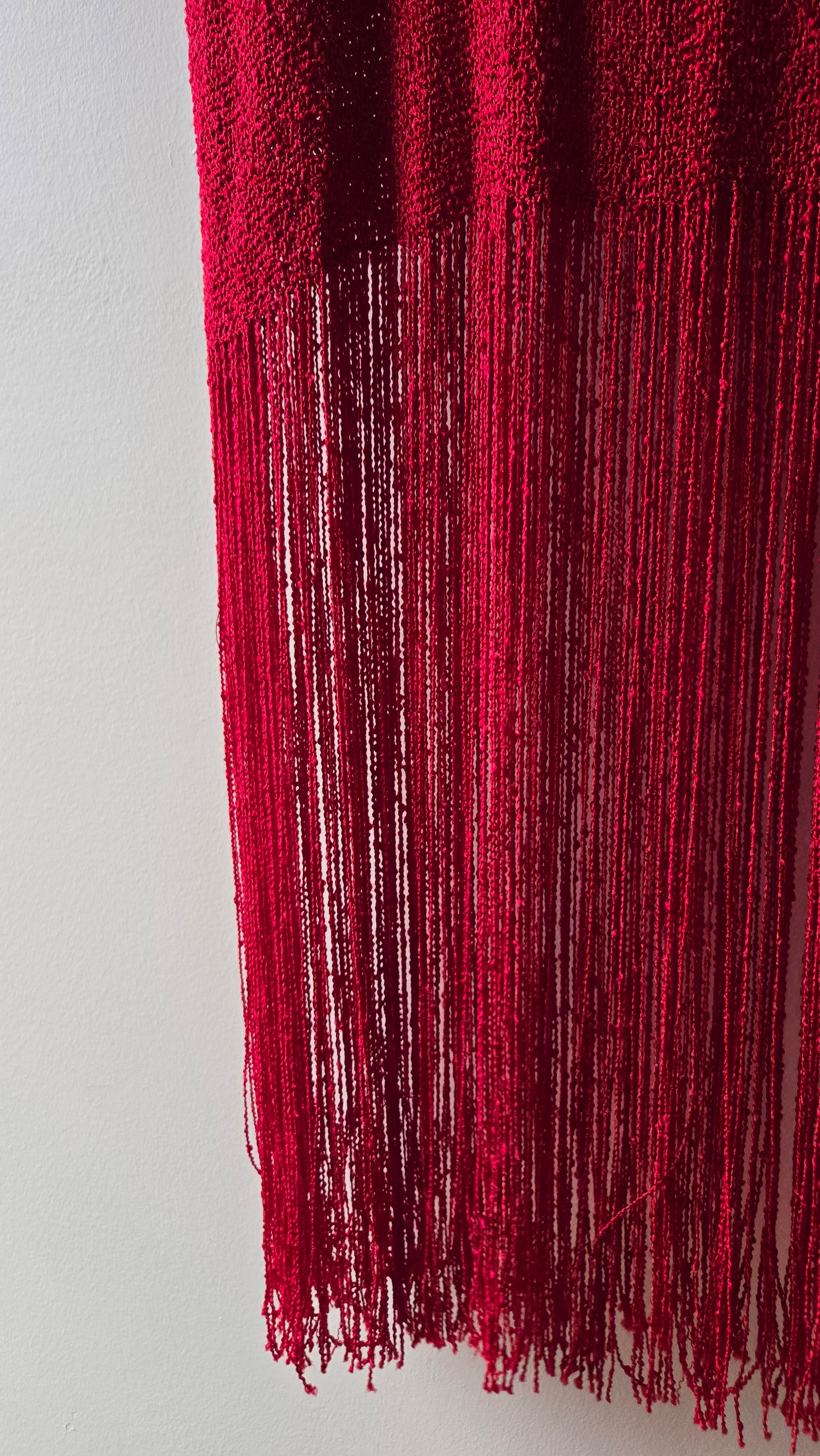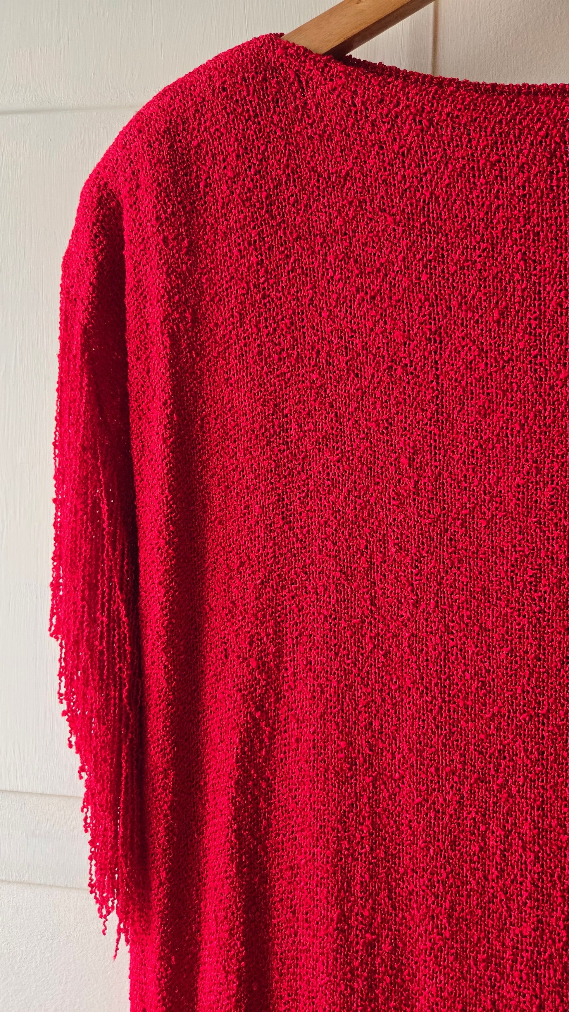 This beauty is a rare dress to find and for good reason! Once they get snatched up they rarely get resold. This dress is handwoven and you can tell - it has the delicate and strict eye of a person who paid attention to every detail. It is heavy with the nubby knit, finely woven, carrying a lot of weight! The sleeves and hem are fringe and flutter with every movement. The neckline is a slight boat neck and the dress has shoulder pads that I would recommend you keep in as it help maintain the draped shape of the dress. A truly stunning piece of vintage! Has a matching cardigan that is not pictured bu included in the purchase!