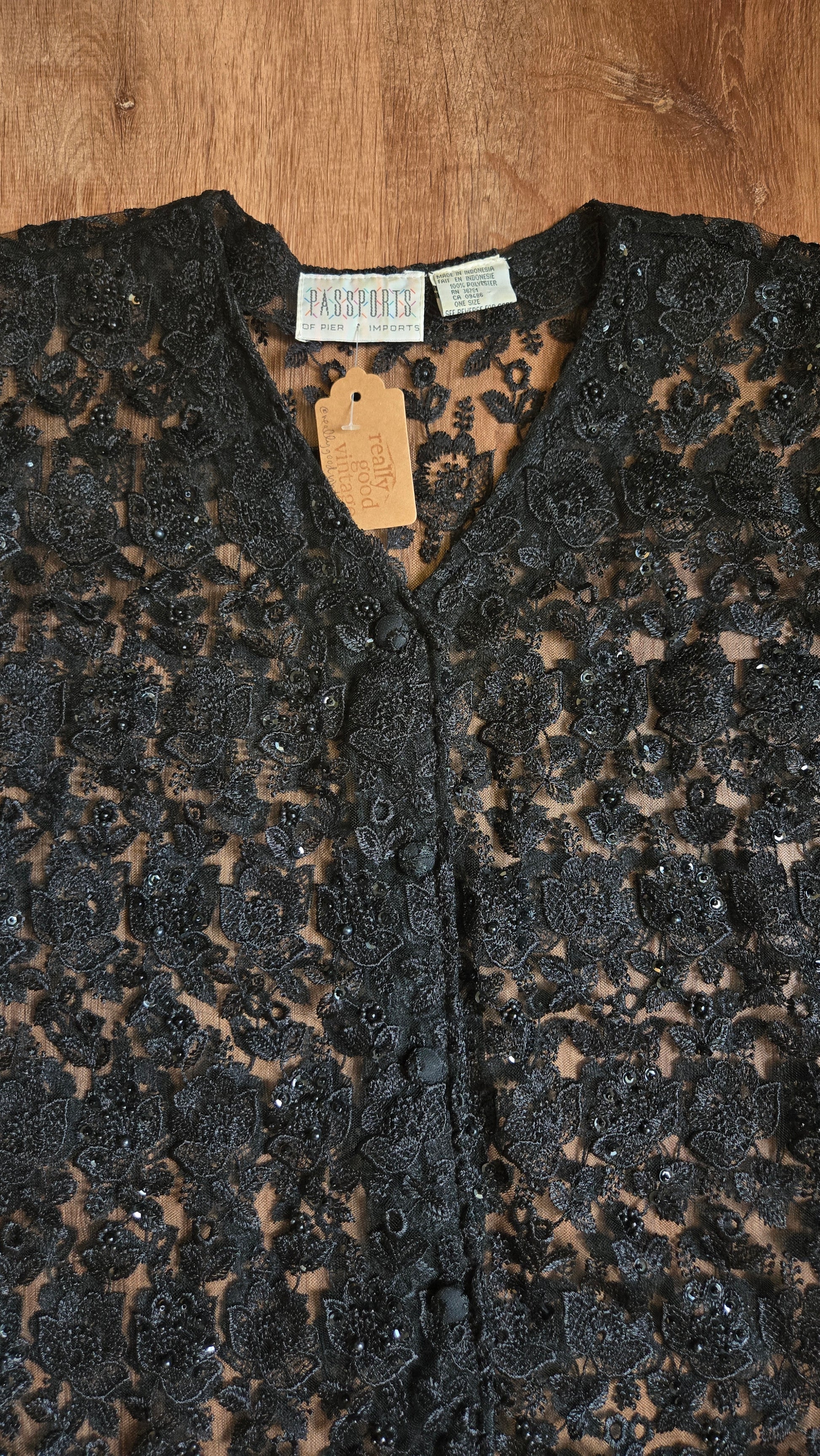 How fun is this! Would be great worn as a top with just a bandeau and some jeans, or as a jacket over a black turtleneck and wide leg pants. Fully sheer, this lace jacket has allover beading, a vneck cut with button placket, and a scalloped hem. No stretch!