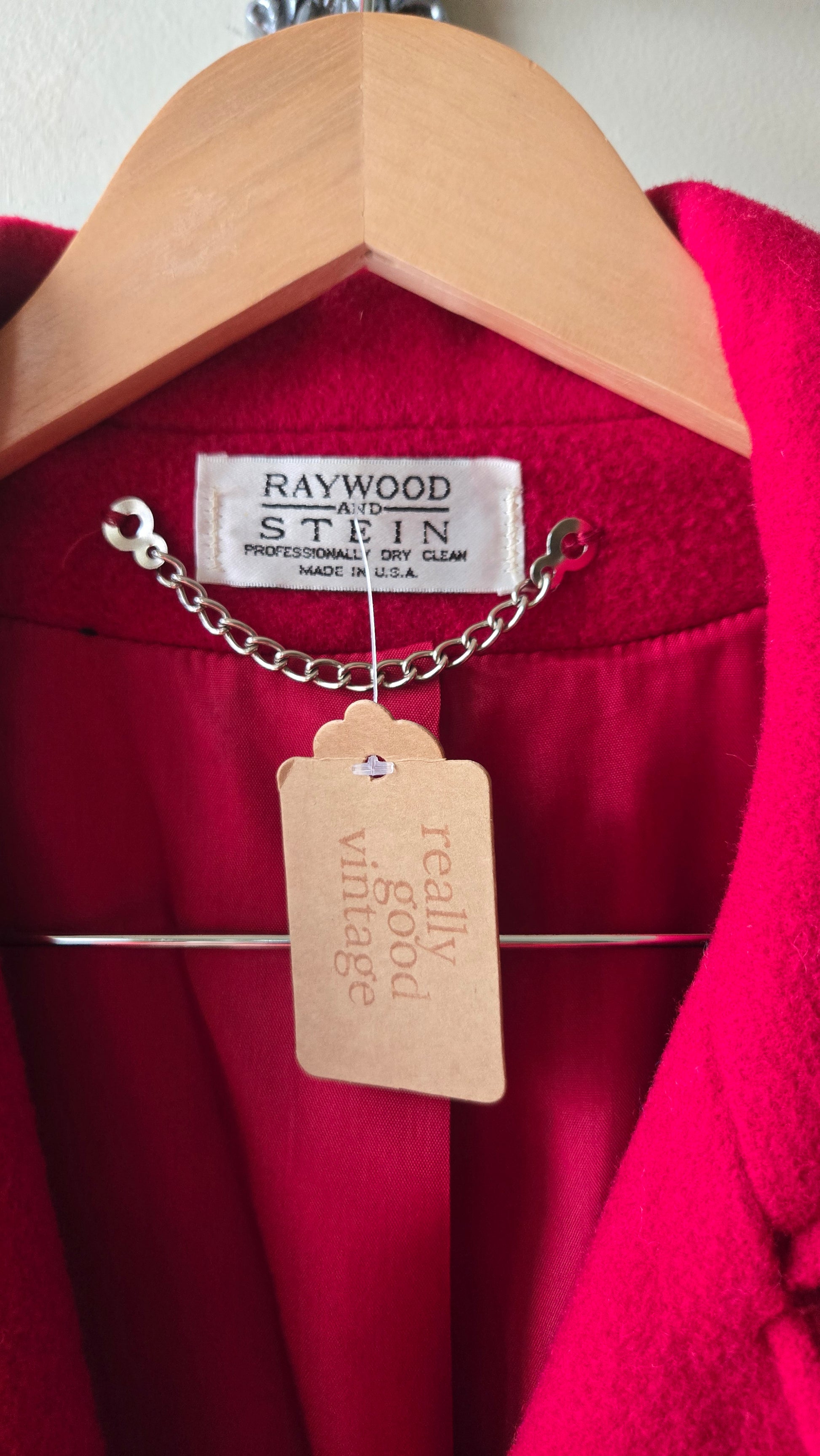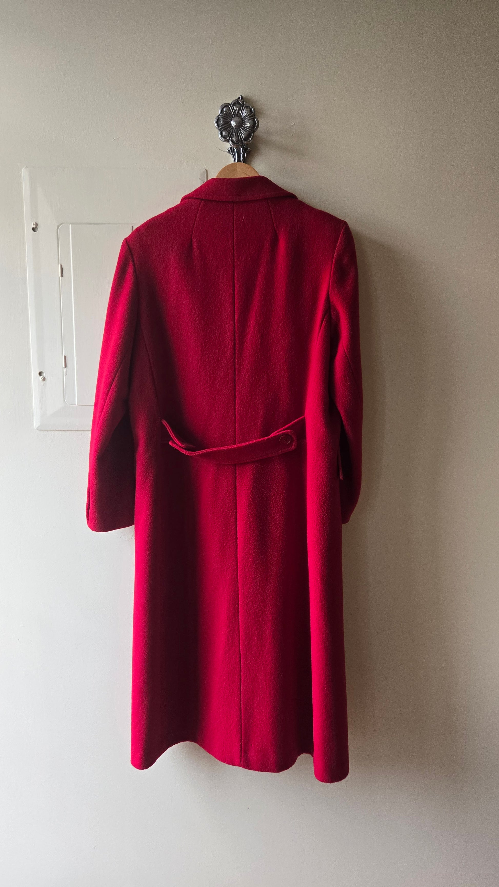 A classic wool coat in a tomato red. Sleek single breasted cut with an extra button in the collar to button all the way up when it's really cold. Fully lined, with two faux flaps at the front that disguise two slit pockets. Has draped belt in the back and rounded collars.