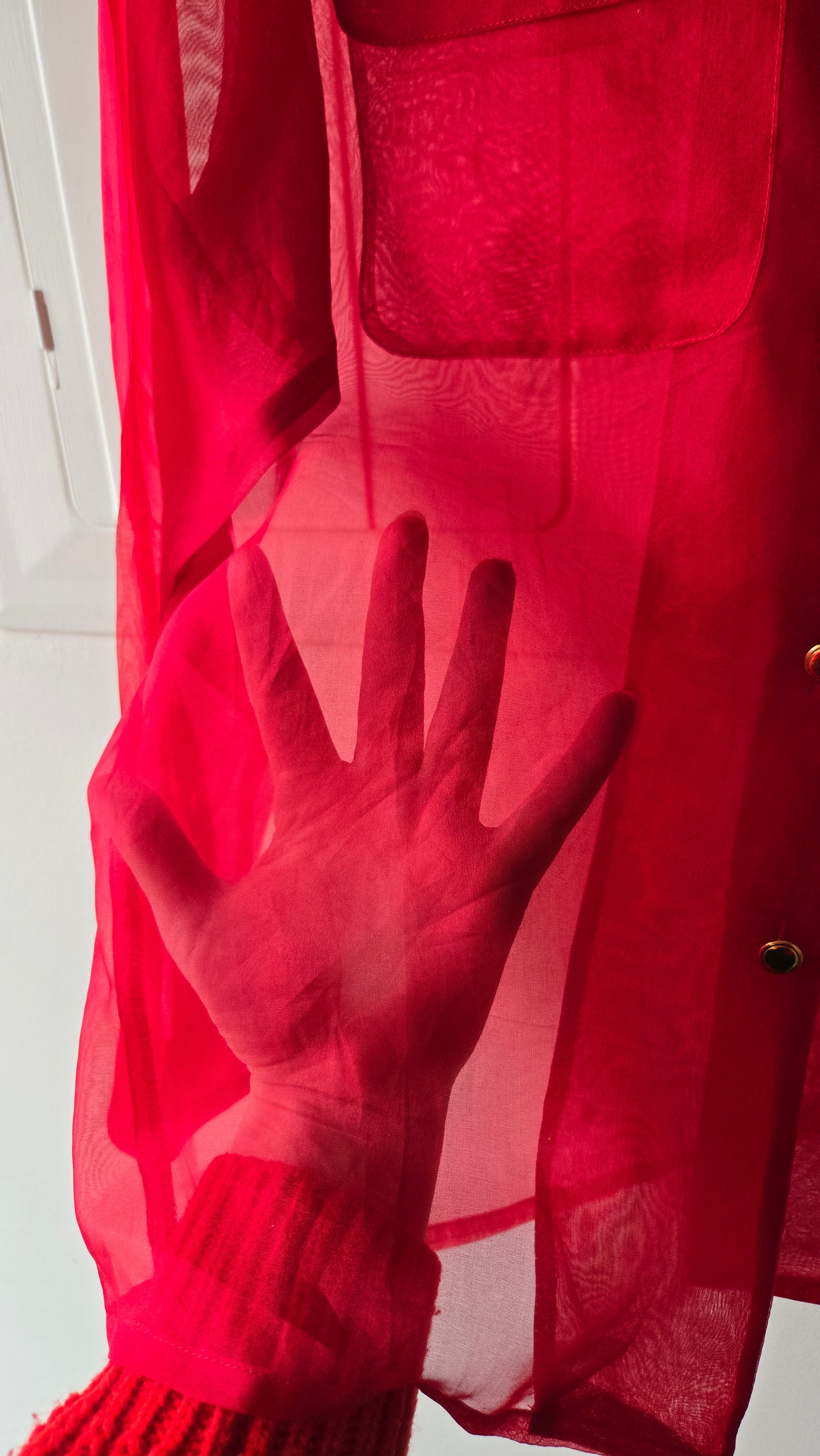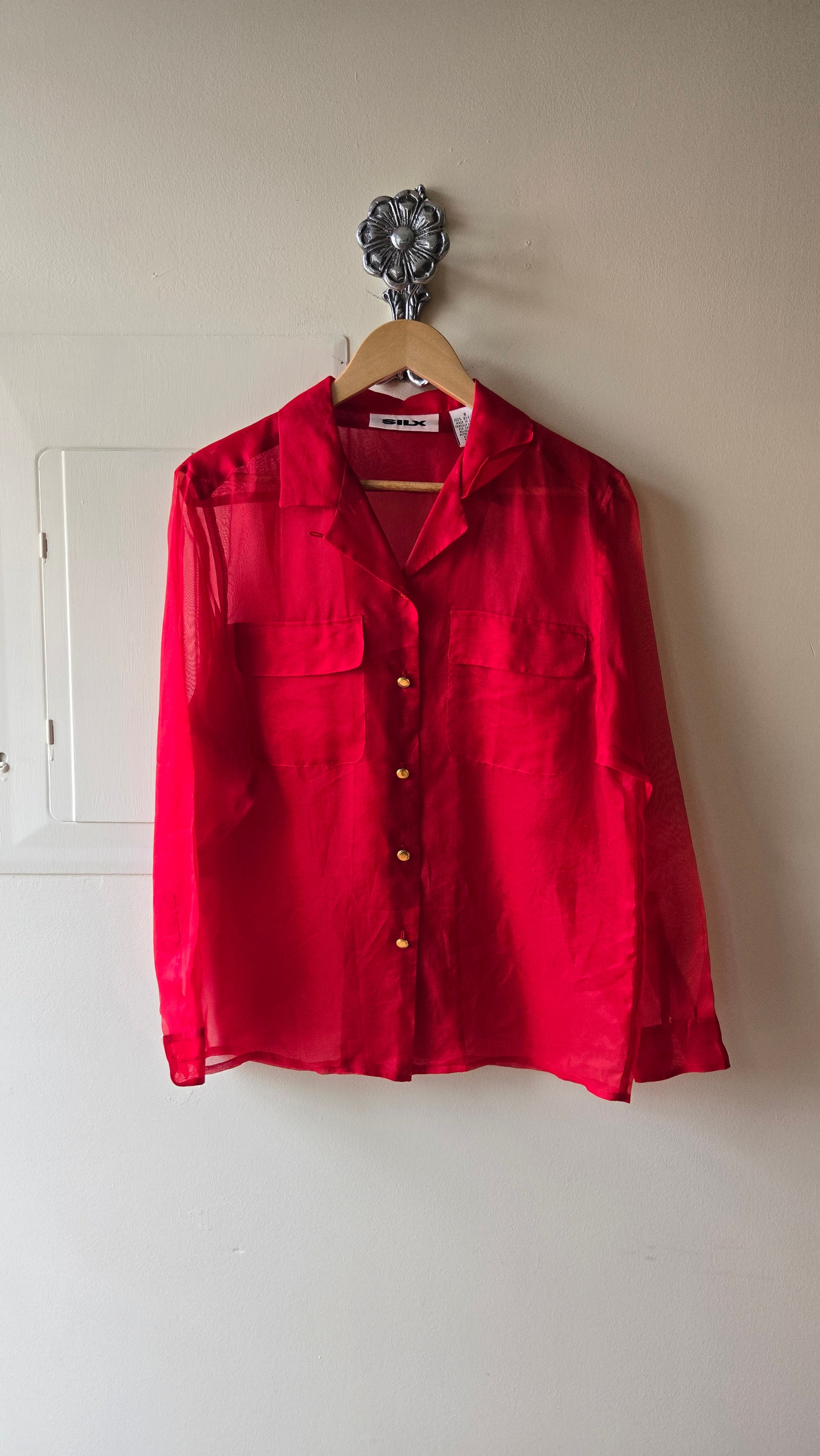 I've found many a black sheer blouse but never a red1 This one is nice and stiff and holds its shape really well. Has to front pockets, and bright gold buttons. It's clearly OTT with the gold pants, but would be super chic with a long pleated plaid skirt for the holidays!