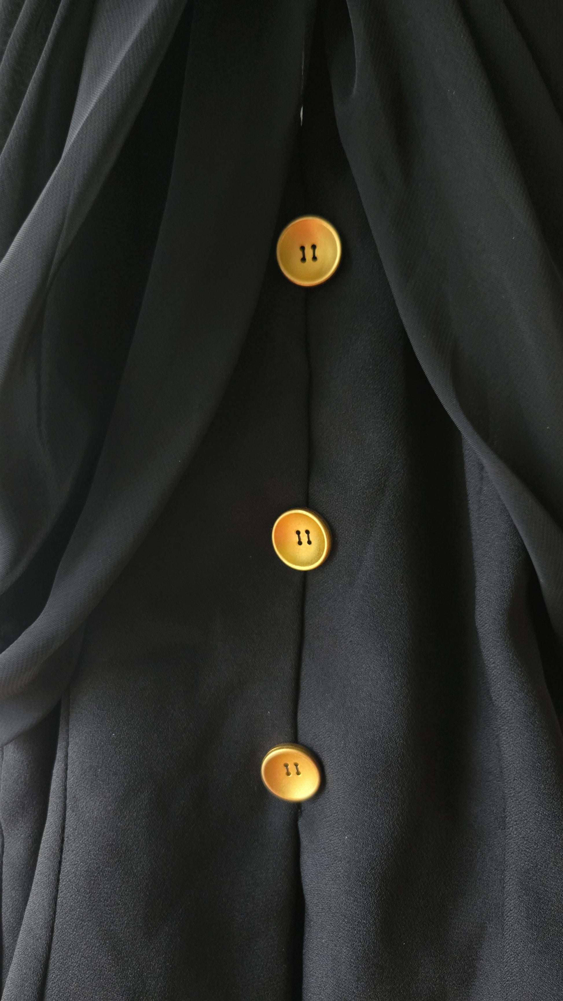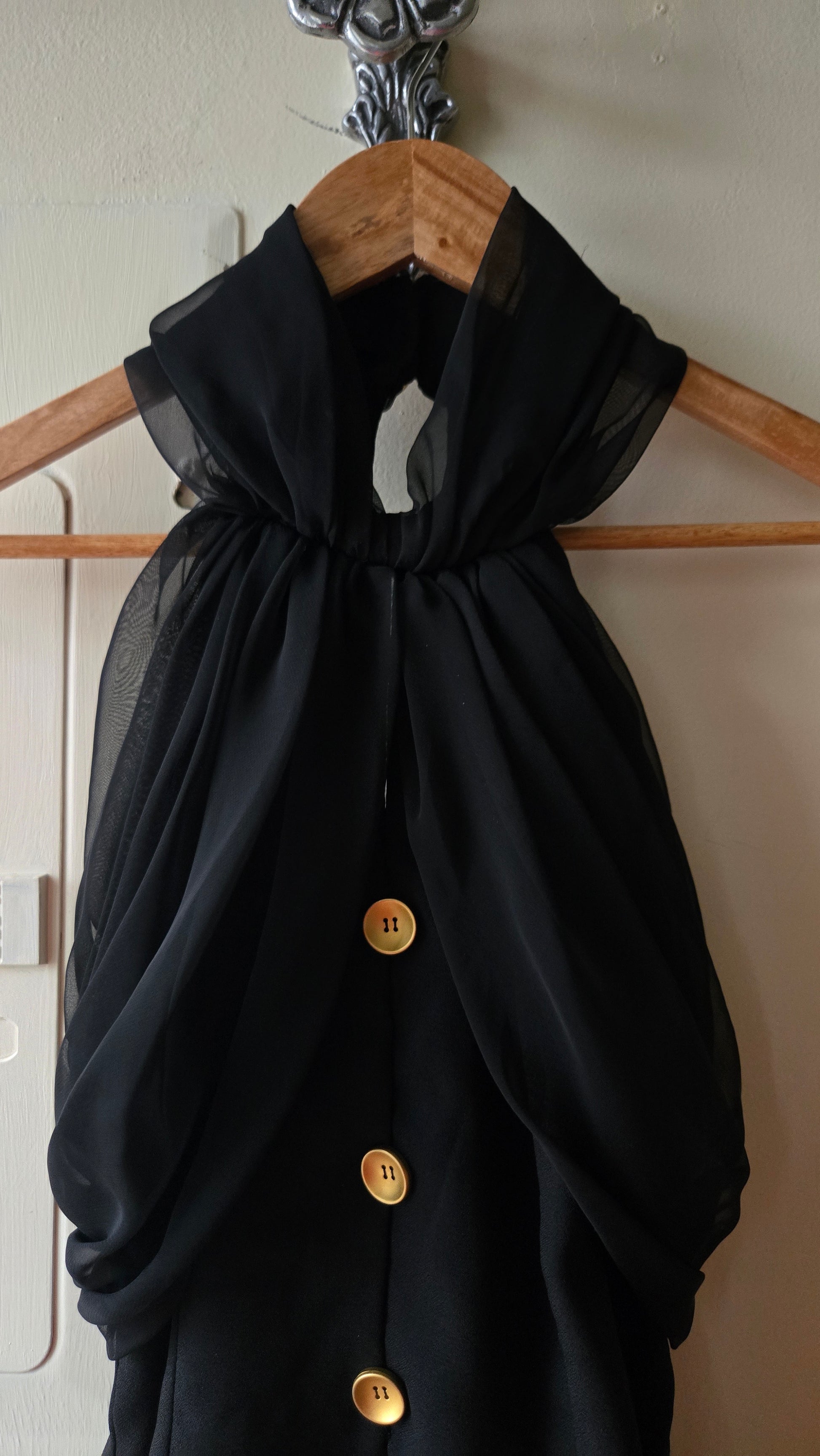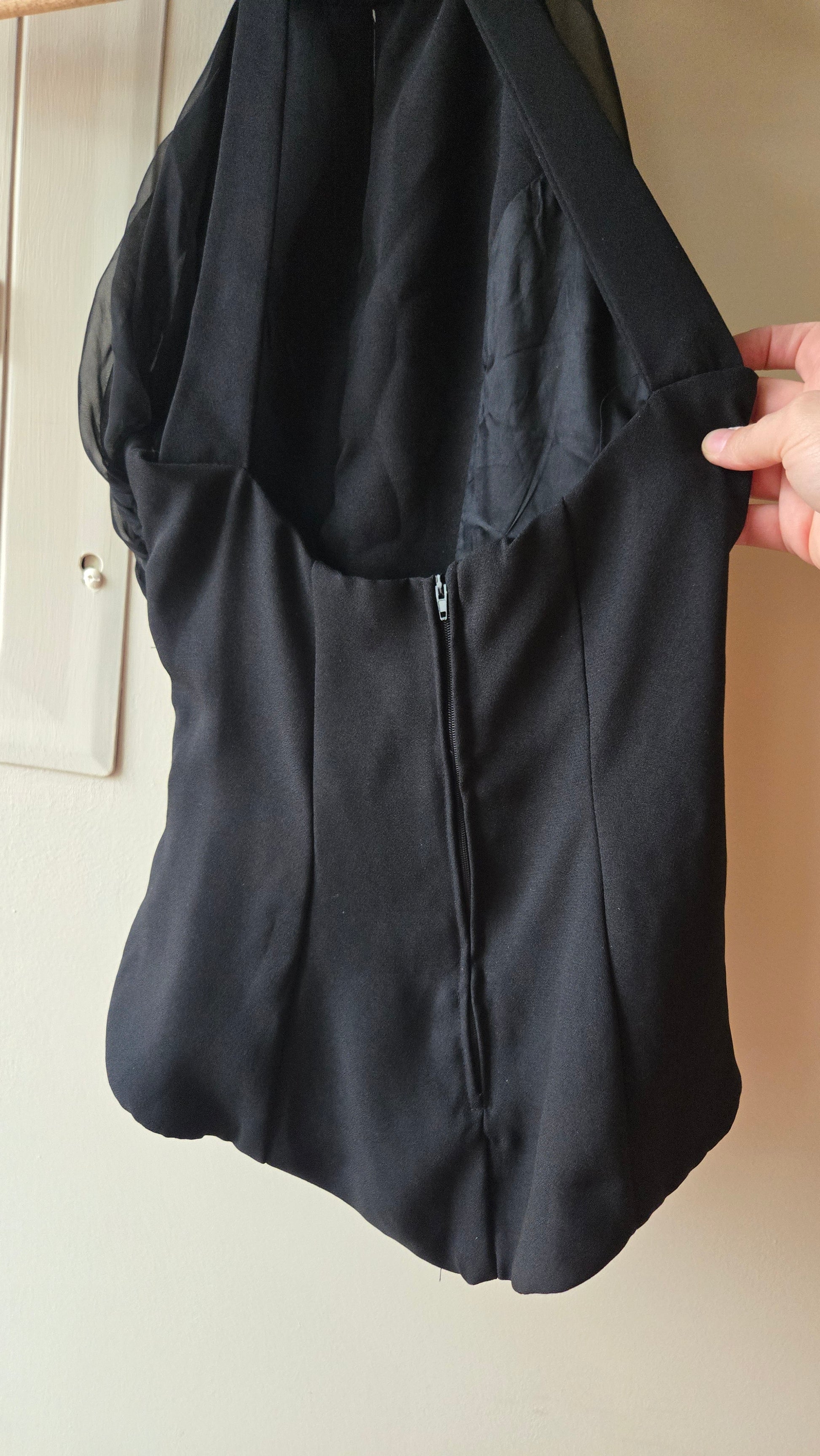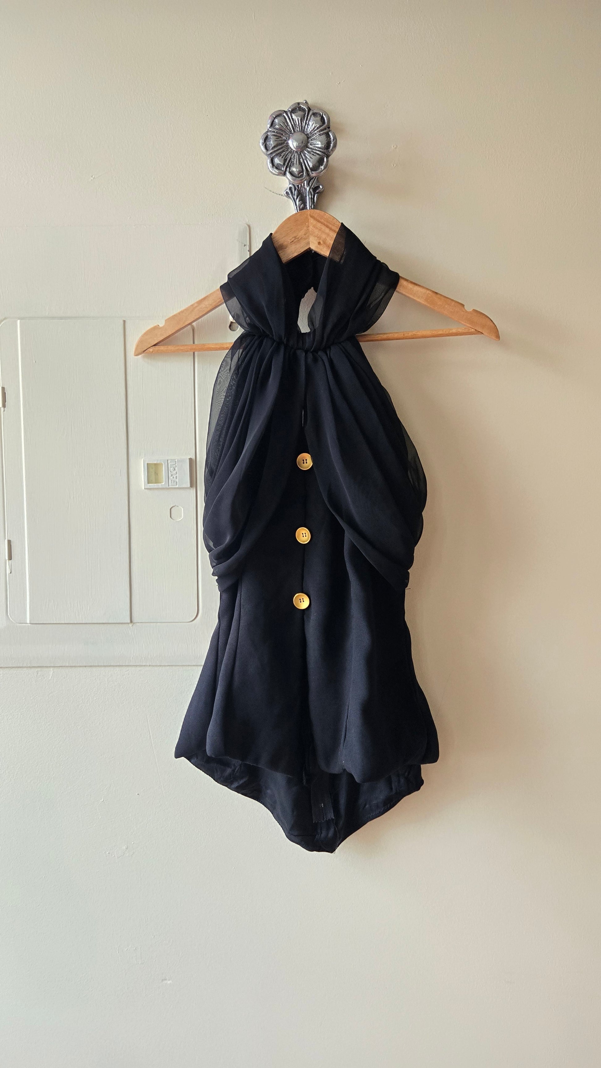 Originally this top had two random rhinestone buttons in the neckline, two at the back of the neck, as well as three cheesy rhinestone buttons down the front but I replaced them all with simple brushed gold buttons for a more modern look. Has a gorgeous sheer neckline with drapes down each side the bust, framing a keyhole at the chest. The bodice has a split hem after the bottom button which gives a peplum effect. The back of the top is its own story with a sexy strappy and open back1 The back of the top is longer than the front, too, which gives it a tailed effect! Fully lined and beautiful.