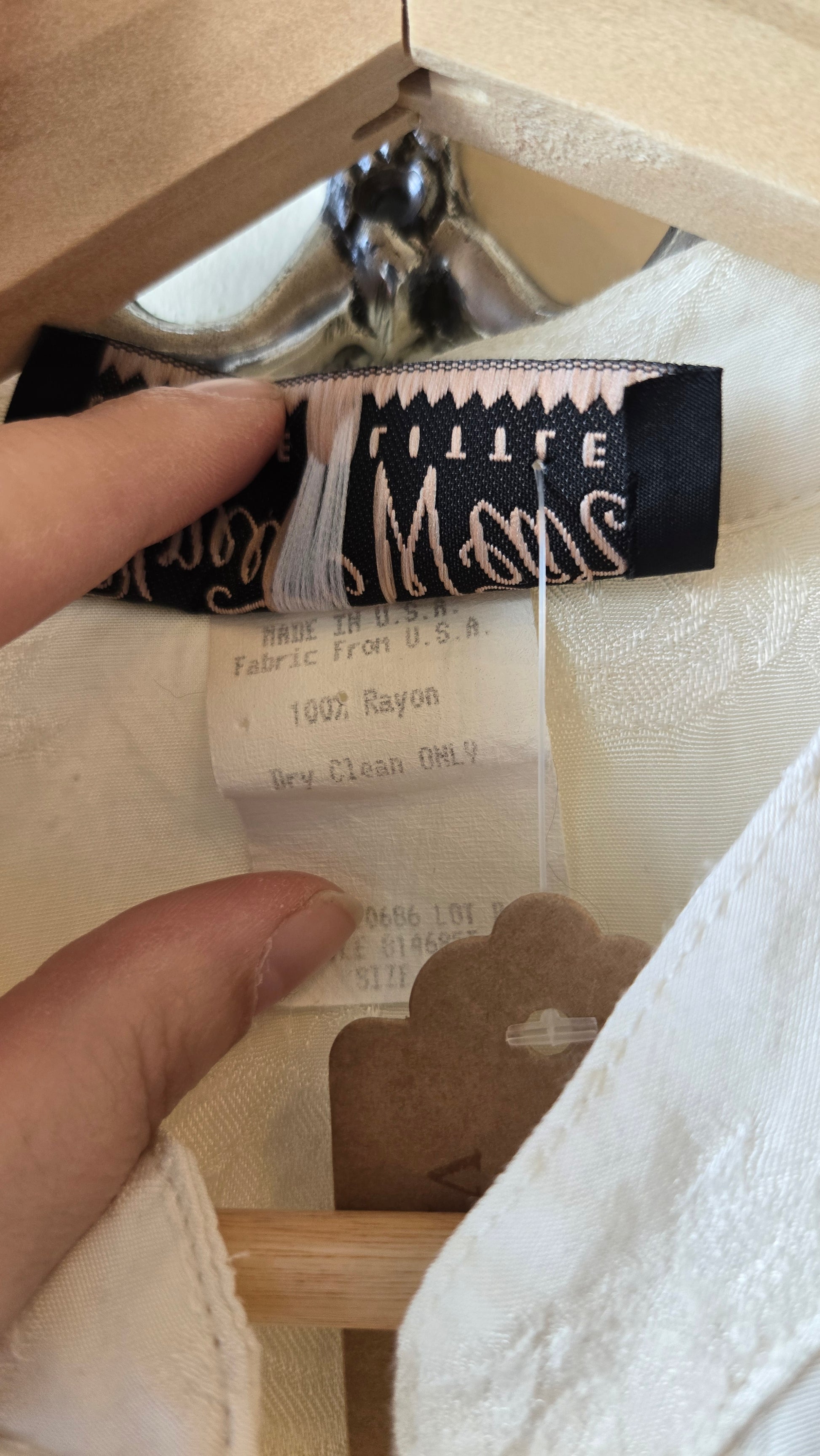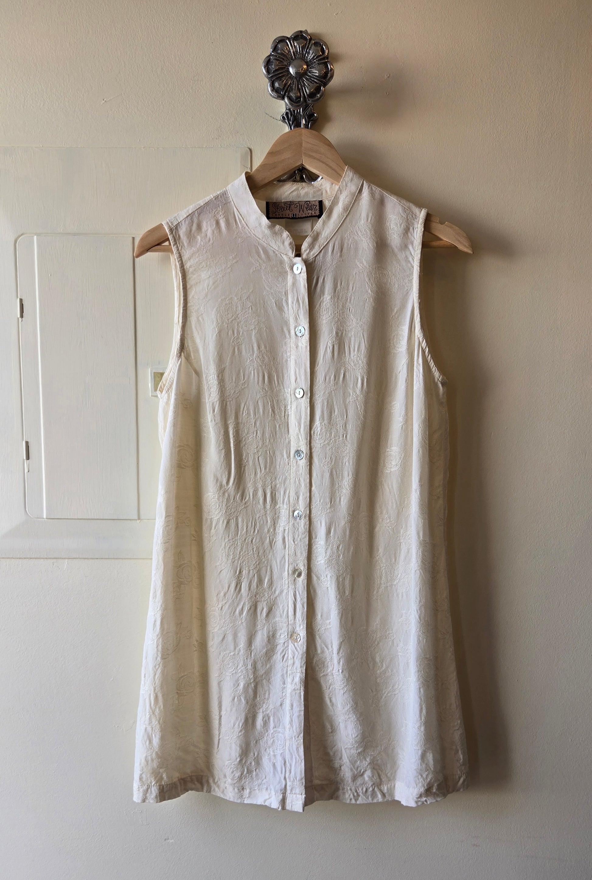 Thin, 100% rayon tunic with embossed roses allover. Has a Nehru collar and mother of pearl buttons. Excellent as a layer in the fall or worn on its own, come the summer!