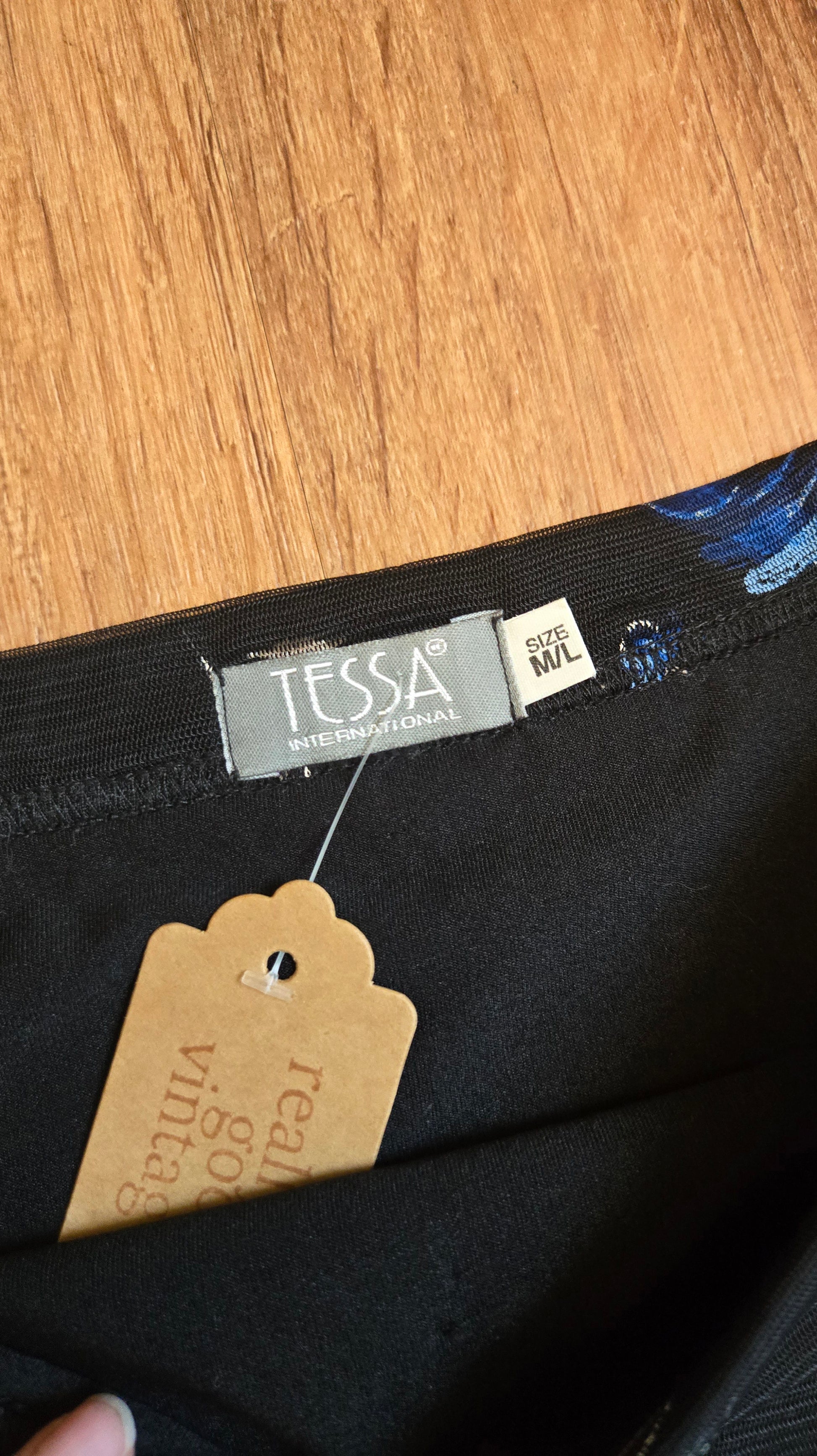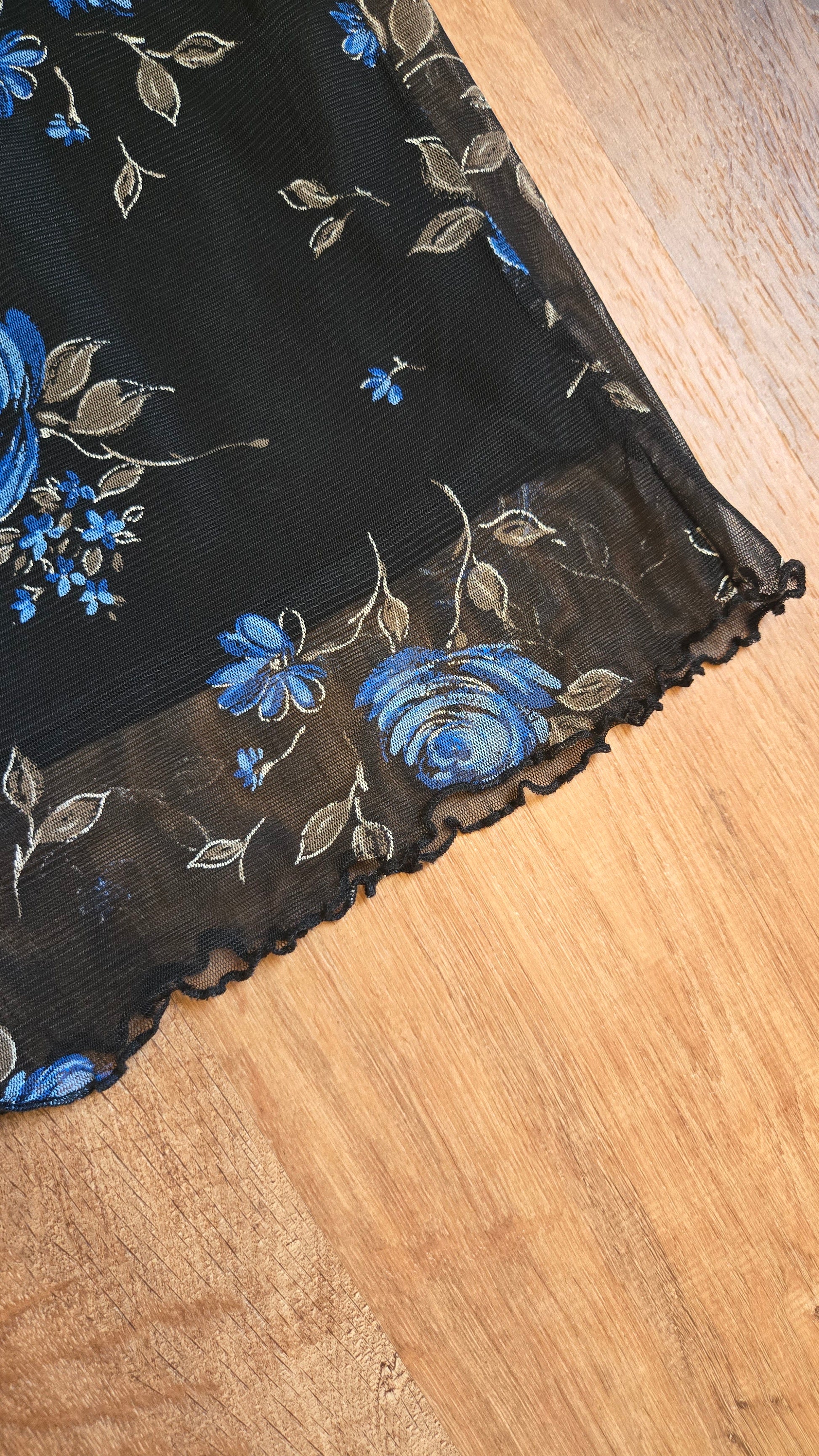 How do I still have this? It's amazing! Stretchy little floral mesh overlay with lettuce hem and a black miniskirt underneath. I love that the mesh exceeds the lining so there's a little sheer strip at the bottom!