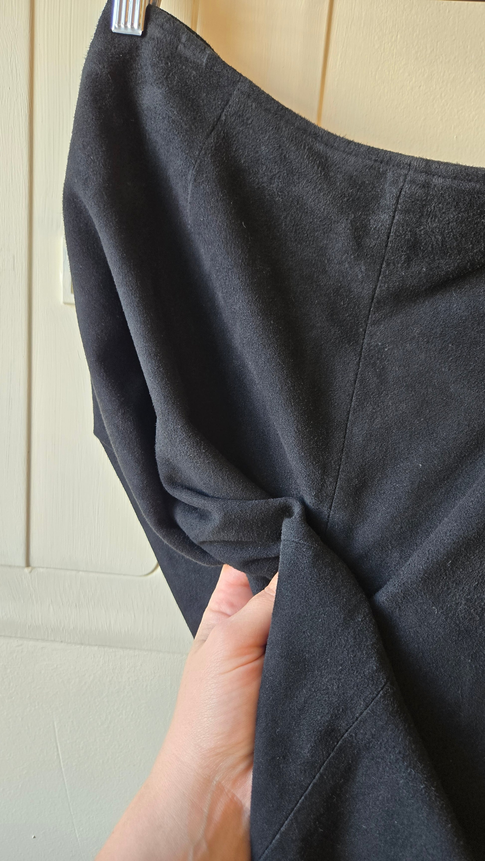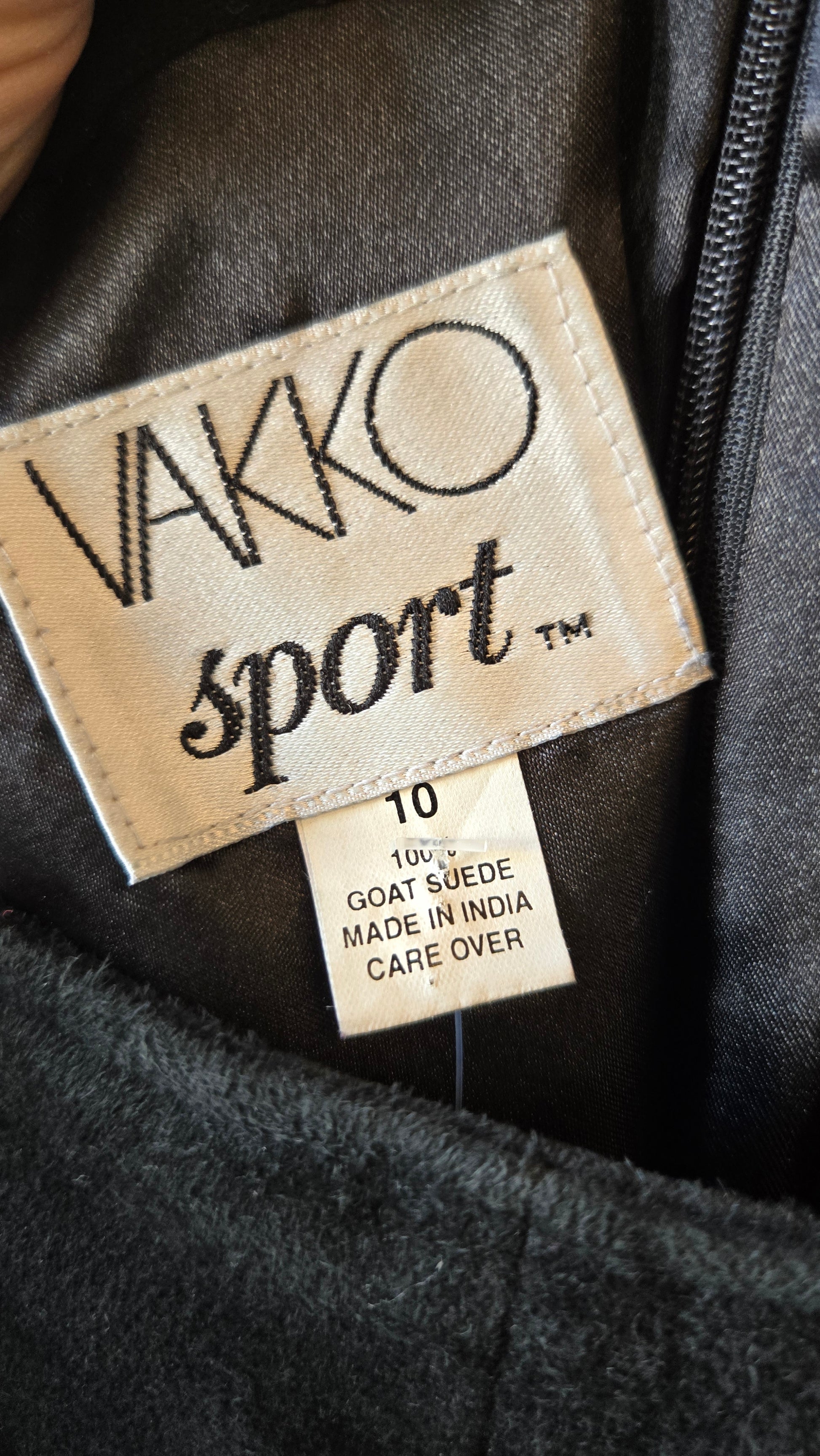 From the Finnish designer, Vakko, there are few more svelte suede and leather designers. This suede is so soft, thin, and supple, it must be a kid or lamb leather. Fully lined, it has one very small flattened area on the front that isn't noticeable when worn (just when photographed). Price reflects this regardless.