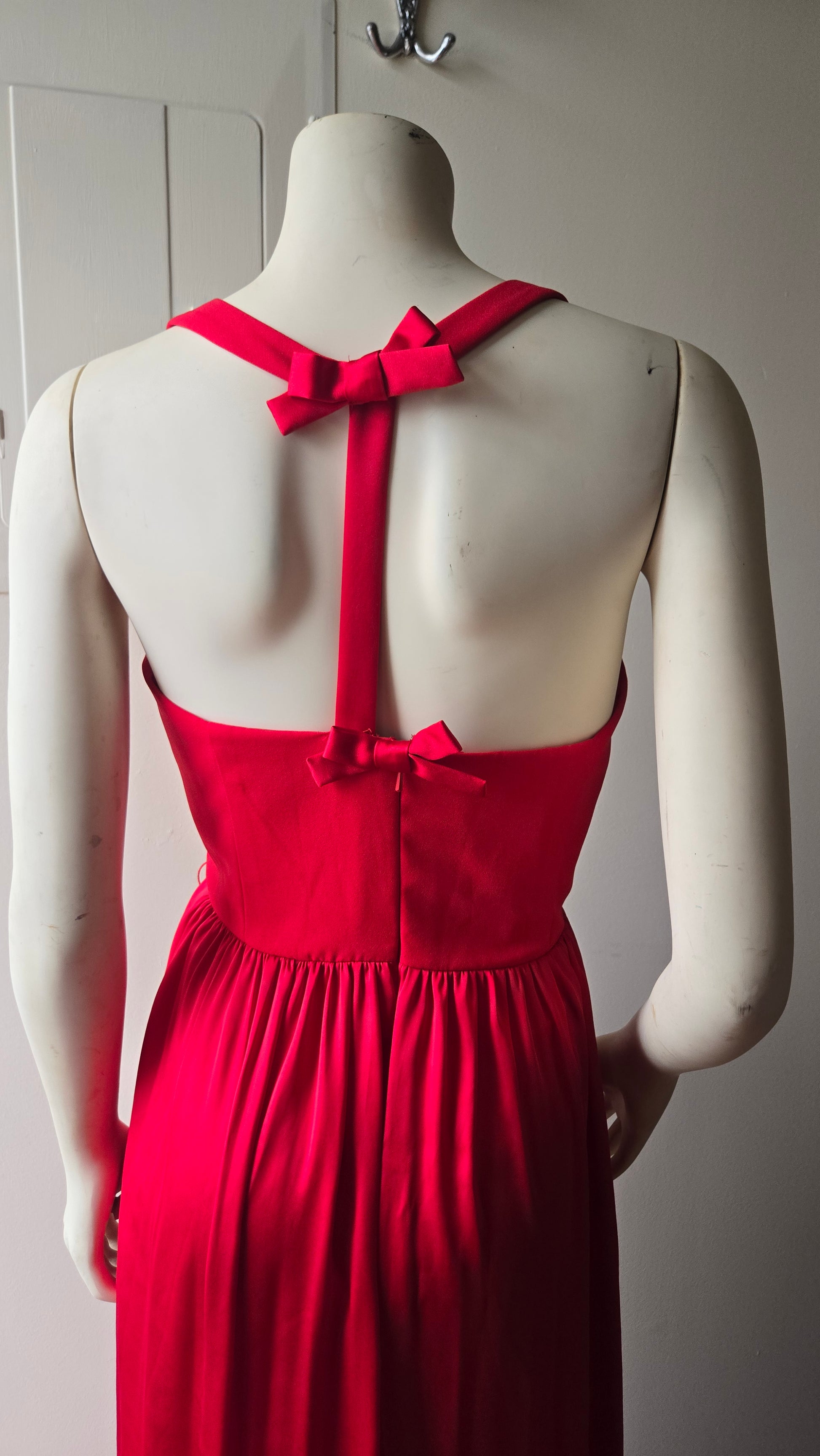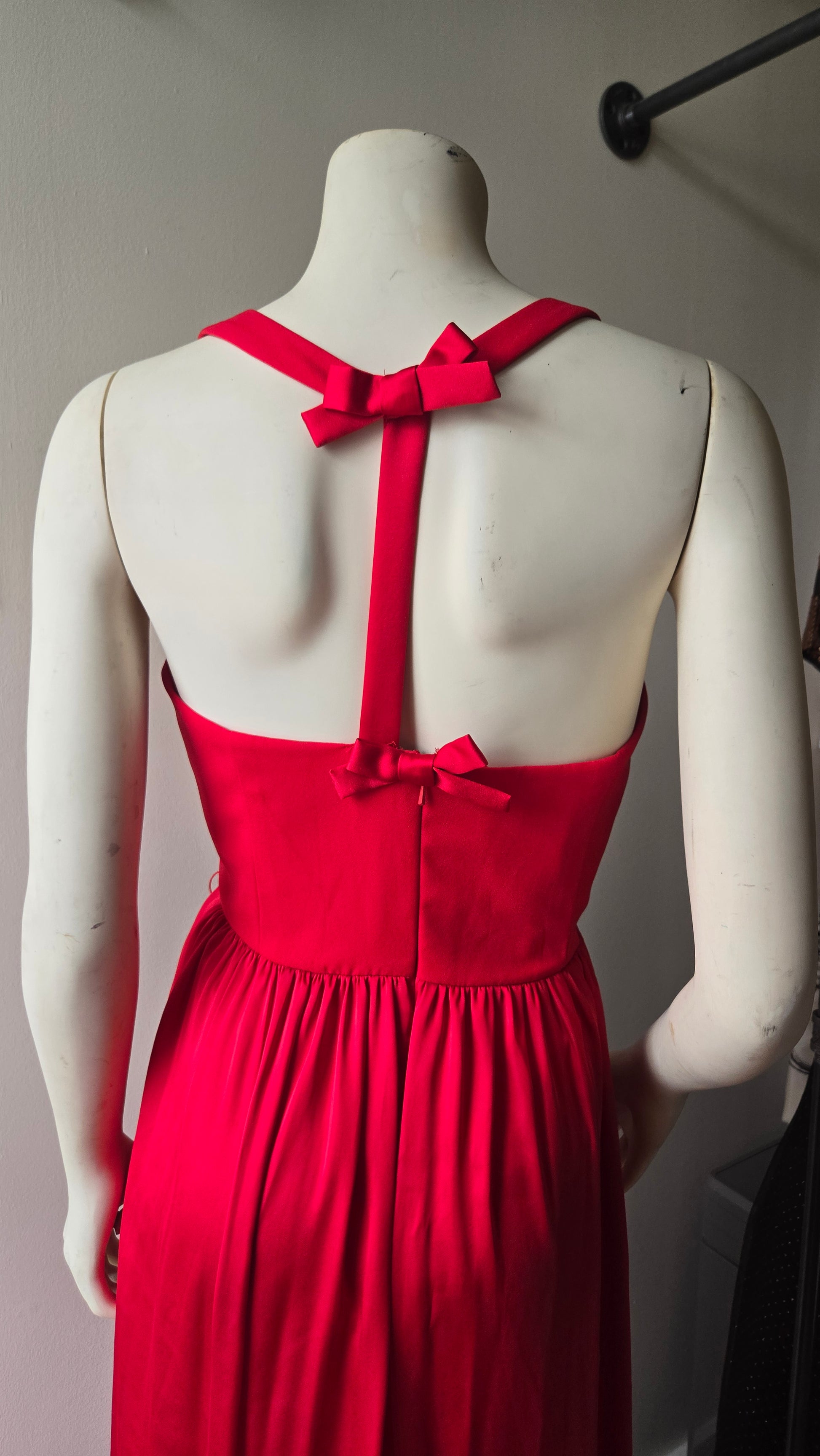 Anyone have a gala or black tie event coming up? This bold red dress has you covered! With a v neckline that meets at the waist with the flowing sateen skirt (that has pockets!!). The bust has boning at the sides, too, to keep you comfortable. My favorite part, though, is the fabulous back that has two bows connected by slim satin straps. Just needs big gold jewels!
